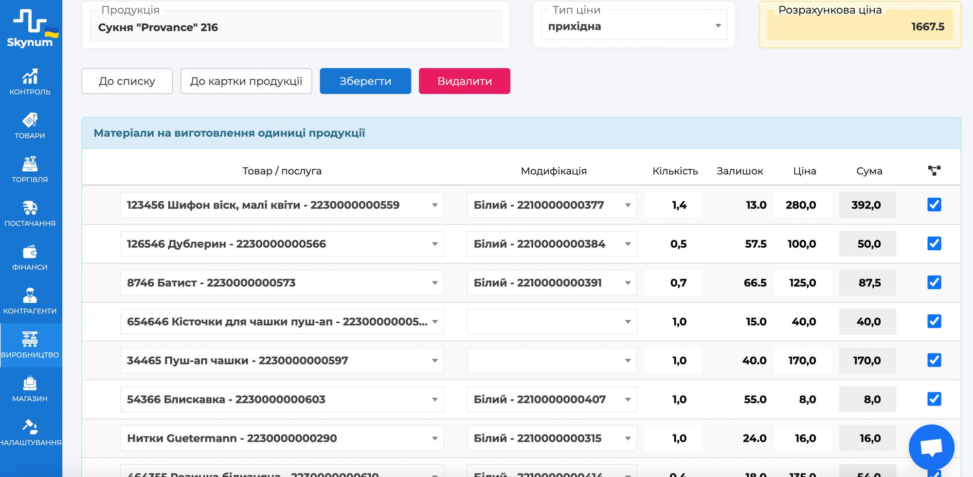 В Skynum кожна технологічна карта може бути змінена, відредагована або видалена за потреби. В технологічній карті прописують типовий шаблон з вказанням набору матеріалів та витрат, що будуть використані на пошиття однієї одиниці товару. При цьому тех. карти зберігають та використовують і для наступних разів пошиття.