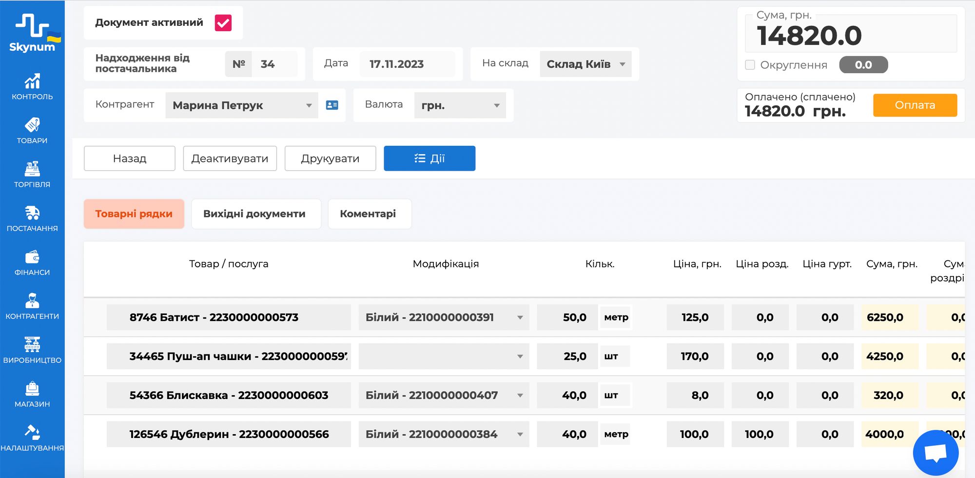 Крім того, якщо ви закуповуєте тканину в постачальників закордоном або ж реалізуєте її поза межами України, то вам однозначно потрібен мультивалютний облік. Невелика кількість платформ може представити такий функціонал, а ще менше — на такому рівні як в Skynum. Це справжній must-have для тих, хто працює з різними валютами.