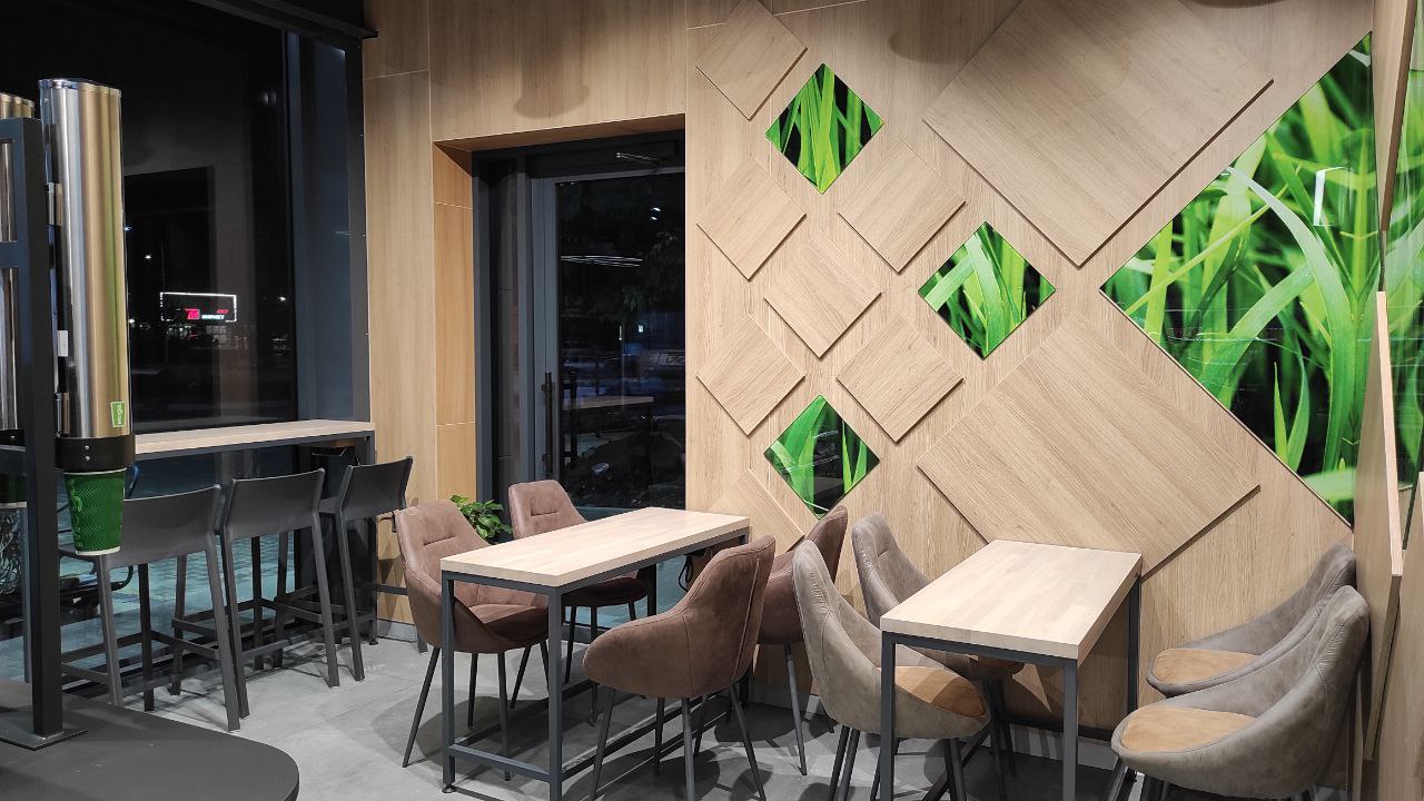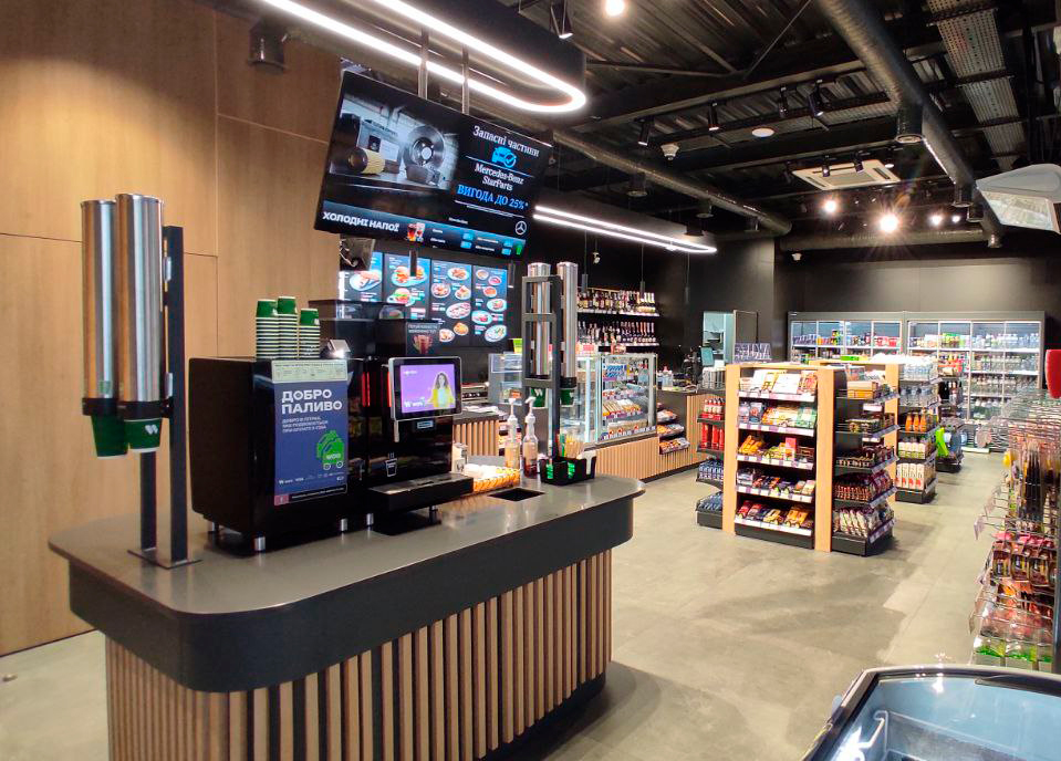 Реновації торкнулись фактично всіх зон: кількість колонок збільшена з 3 до 5 — тепер тут може одночасно заправлятися 10 авто, відтепер кава розміщена на острові, що покращує мандрівку споживача й ергономіку торгового залу загалом. Для швидкого обслуговування гостей було встановлено додаткову касу.