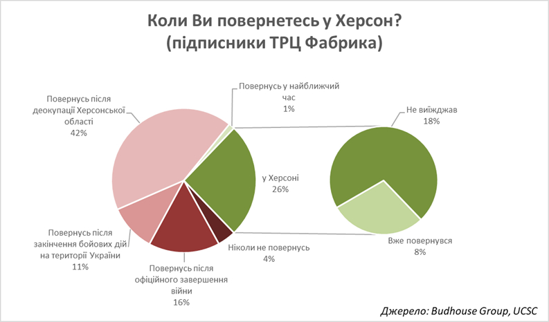 Частка тих людей, що повернулися у Херсон ще не значна — 8%. Це пов’язано з постійними обстрілами. Ще 1% планує повернутися у місто у найближчий час. Переважна більшість людей пов’язує своє повернення до міста з деокупацією Херсонської області, що призведе до поліпшення безпекових умов, оскільки до Херсону не буде доставати польова артилерія росіян. Коли це відбудеться, 42% мешканців повернеться до міста і ситуація буде нагадувати ту, що ми зараз спостерігаємо у Харкові — у місті буде приблизно 2/3 мешканців. Ще 25% будуть очікувати завершення бойових дій або офіційного завершення війни. Не планують повертатися до міста за жодних обставин лише 4% мешканців.