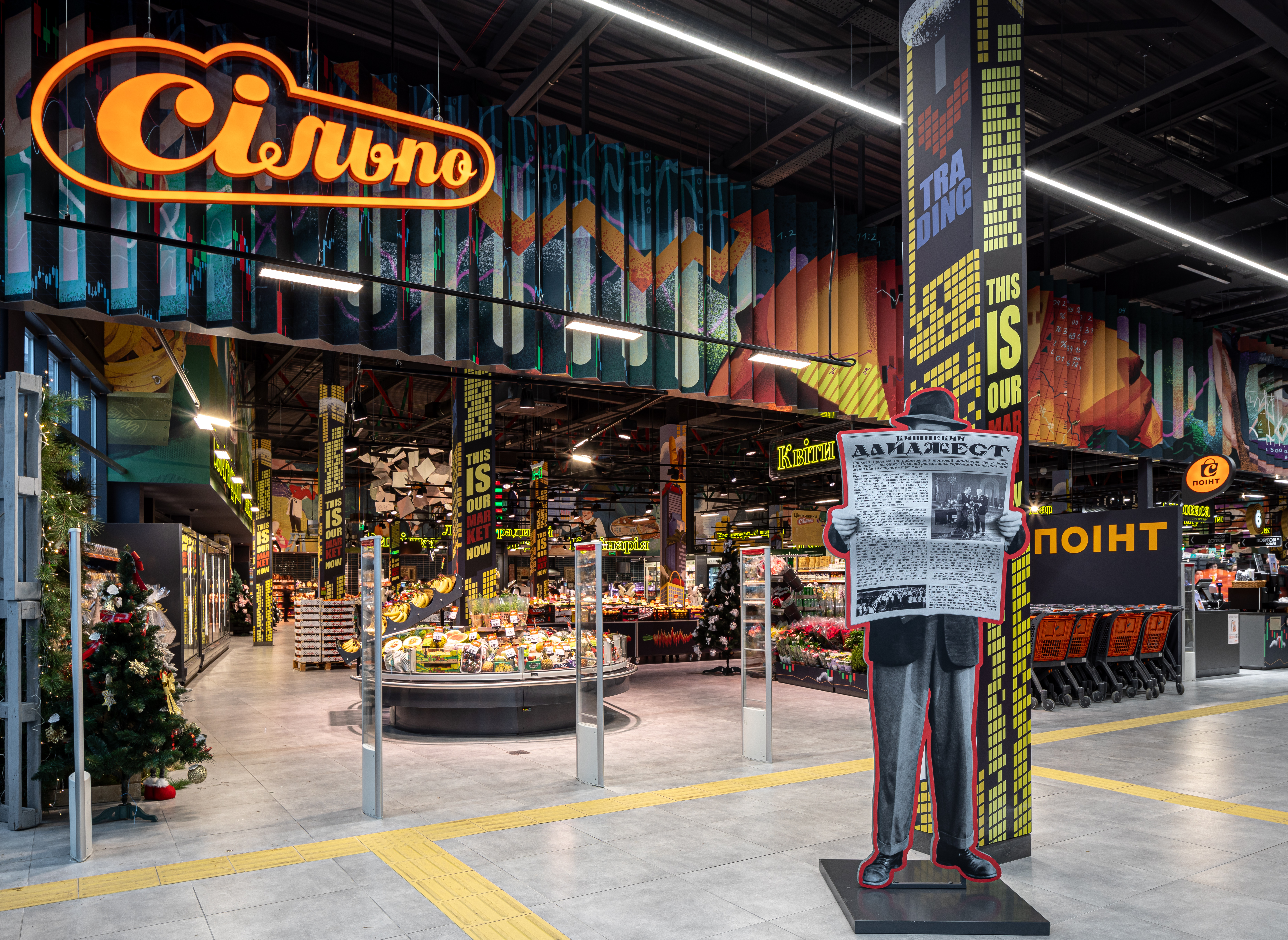 Команда «Сільпо» присвятила стиль супермаркету біржі. Купувати чи продавати? Бик чи ведмідь? Натхнені атмосферою світу, де панує шалена енергетика та свої закони, «Сільпо» поєднало у оформленні магазину дві епохи розвитку біржових торгів, починаючи з галасливої паперової до цифрової з комп’ютерами та криптовалютами. Колони у магазині оформлені у вигляді хмарочосів з трейдерськими плакатами, а шлях до товарів гостям вкажуть навігаційні стрілки з назвами вулиць.