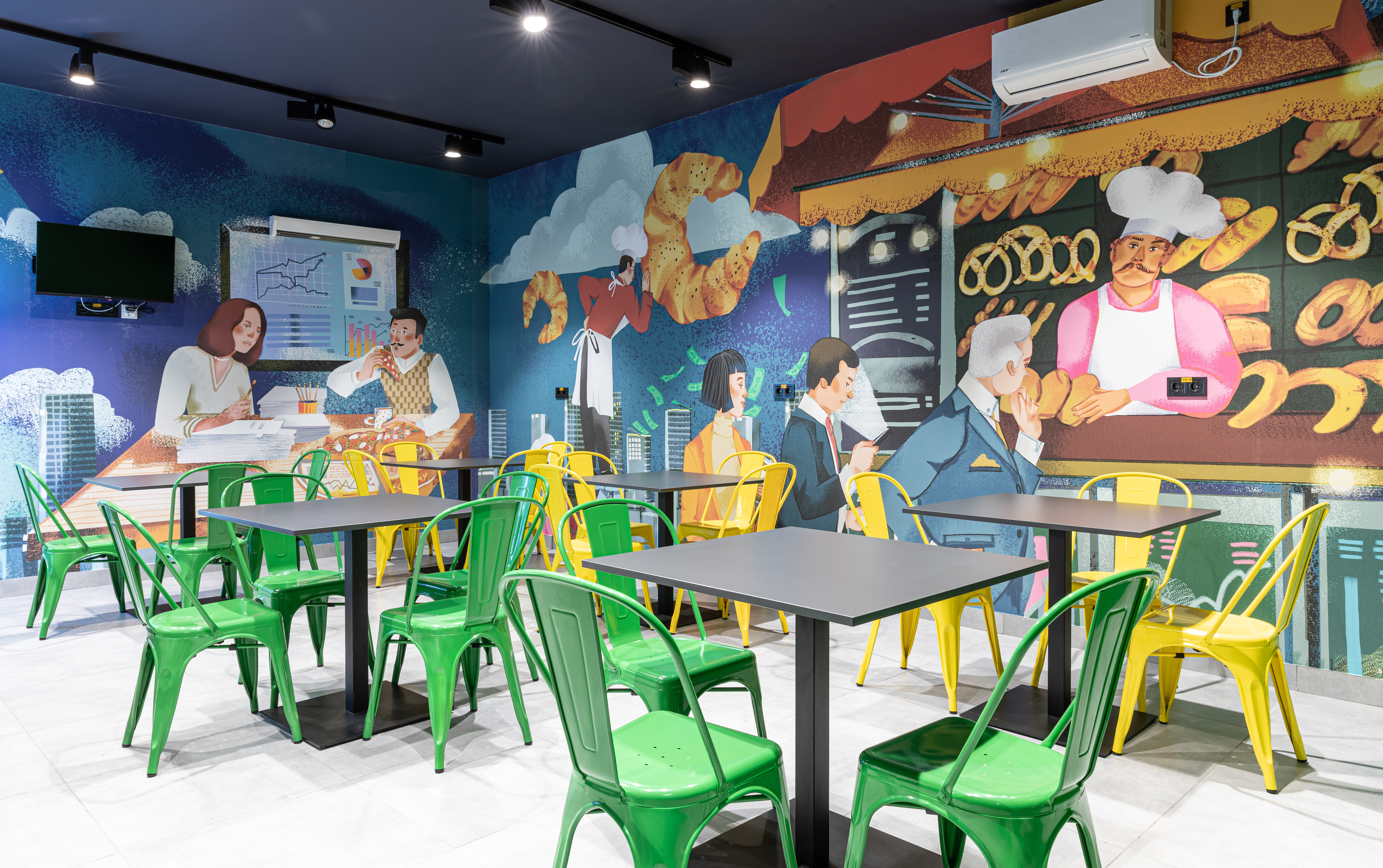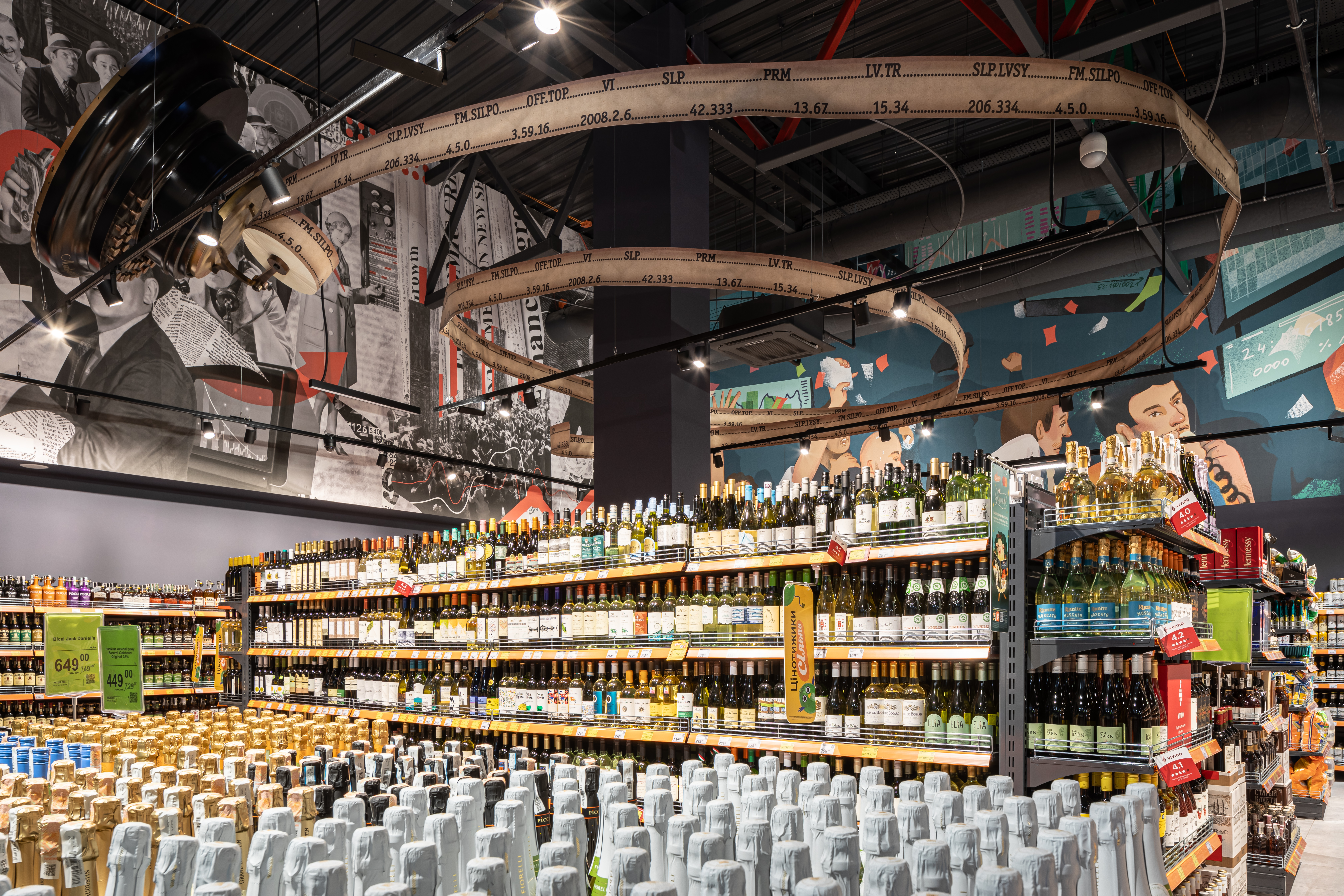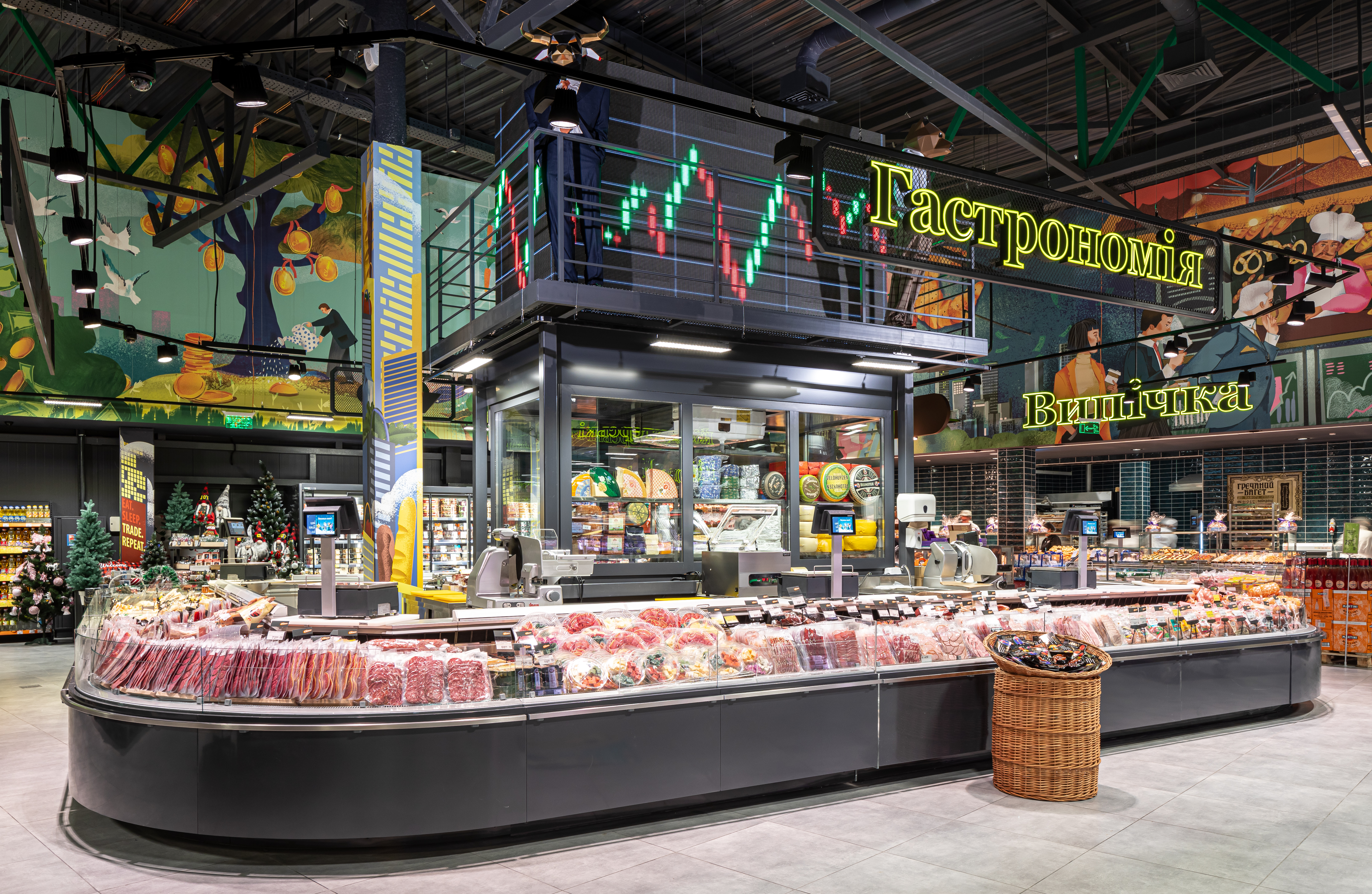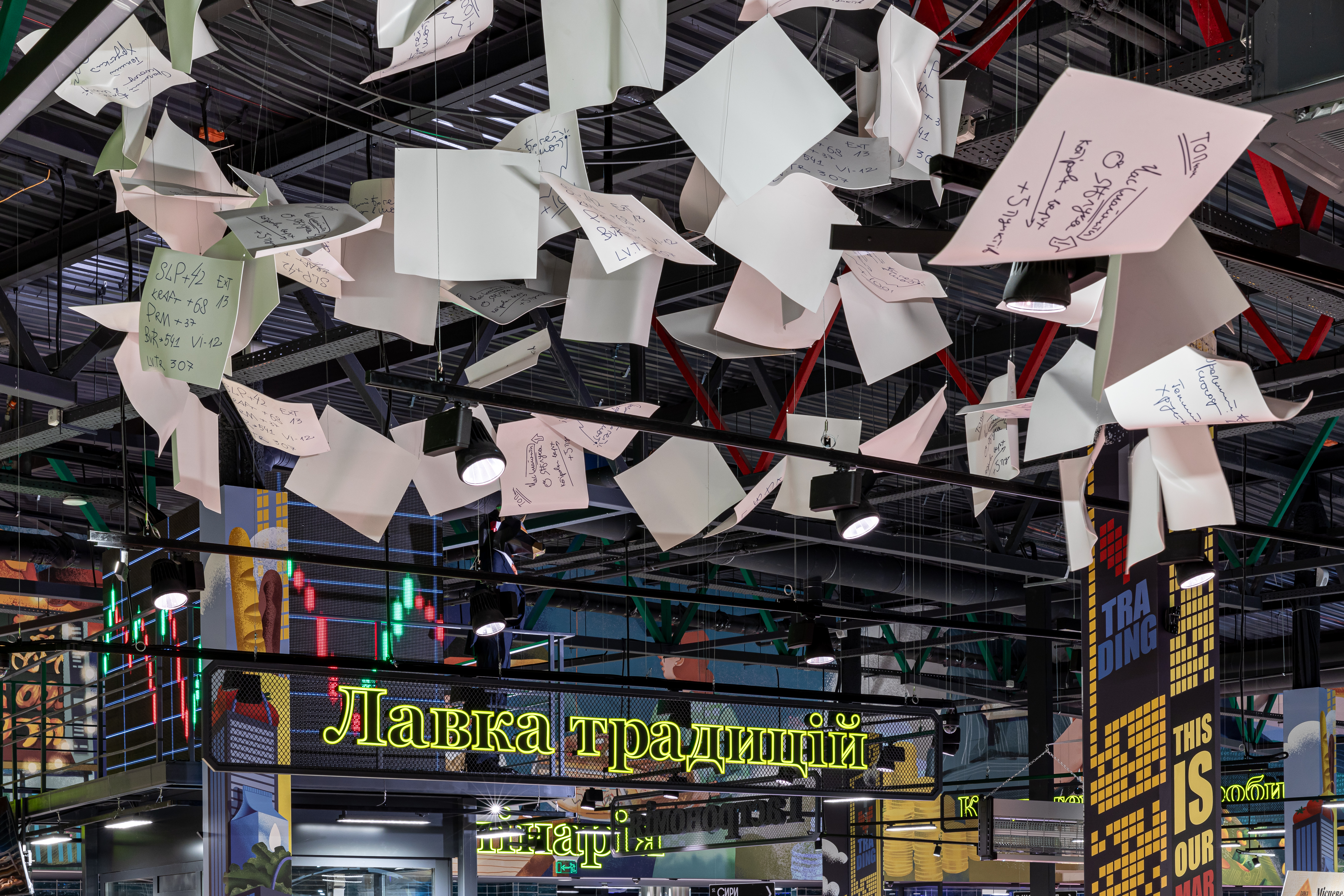 Ілюстрації на шпалерах розповідають про насичене життя трейдерів, а у зоні алкогольного відділу можна роздивитися старі фотографії брокерів та торгів. Саме тоді вся інформація фіксувалась трейдерами на листочках. Під кінець дня цих записок було так багато, що у торговому залі утворювалось ціле паперове торнадо — його гості можуть бачити в зоні найсоковитіших овочів і фруктів. Також у магазині не забули про символи біржевих торгів — ведмедя та бика. Їхні тотеми спостерігають за тим, щоб кожен гість знайшов для себе найкращі пропозиції.