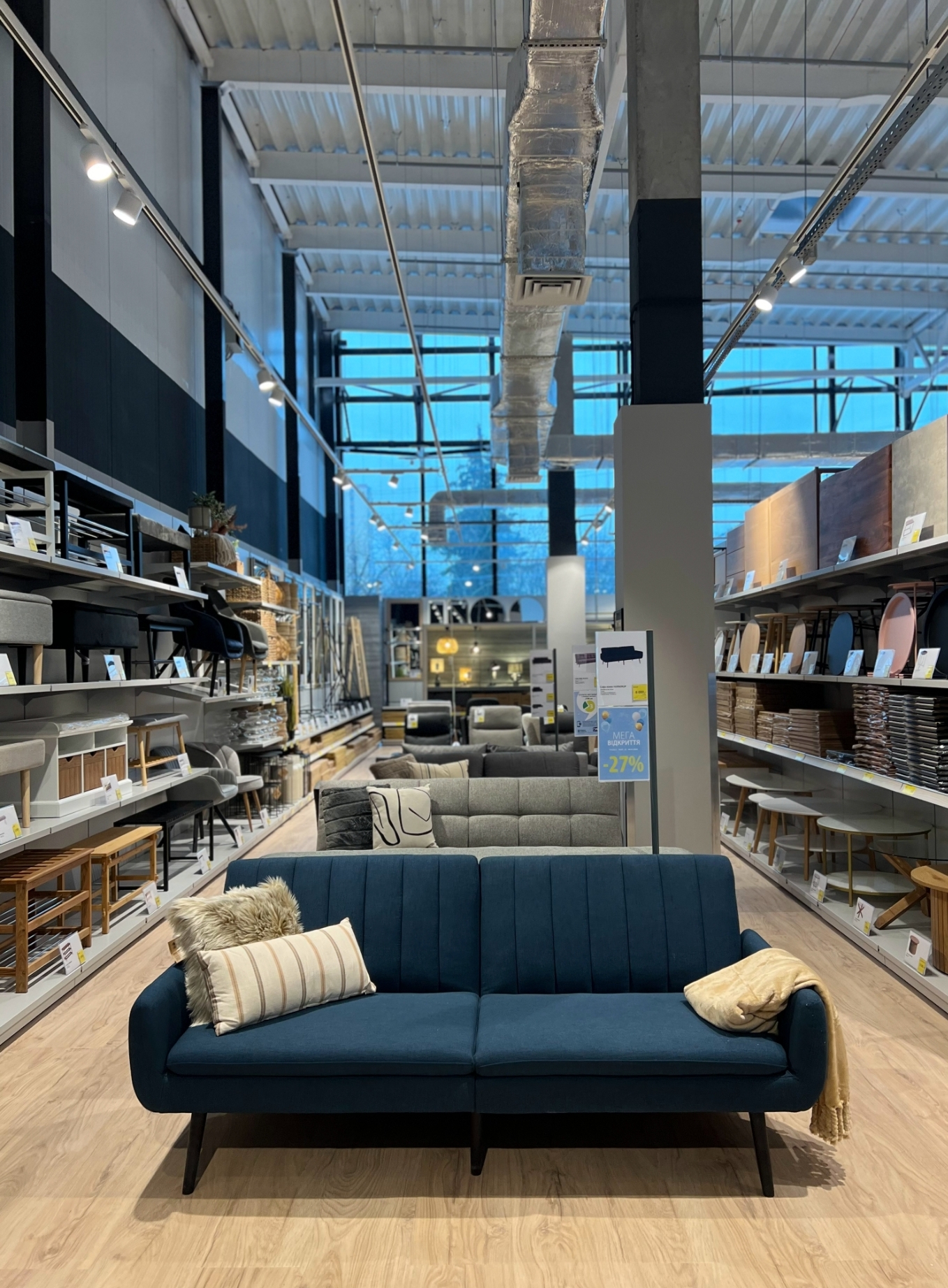 Як і всі нові та оновлені магазини мережі, він побудований за сучасною концепцією 3.0, із сучасним точковим освітленням та просторим дизайном, зональним розміщенням товарних категорій для більш комфортних покупок, зокрема просторою матрацною студією тощо.