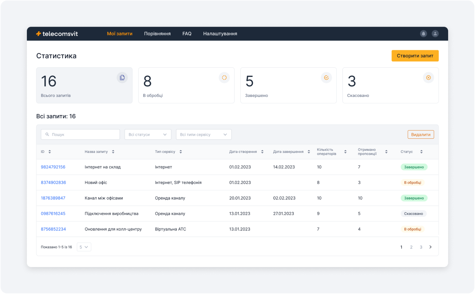 - Запити на телеком-послуги за індивідуальними вимогами та параметрами