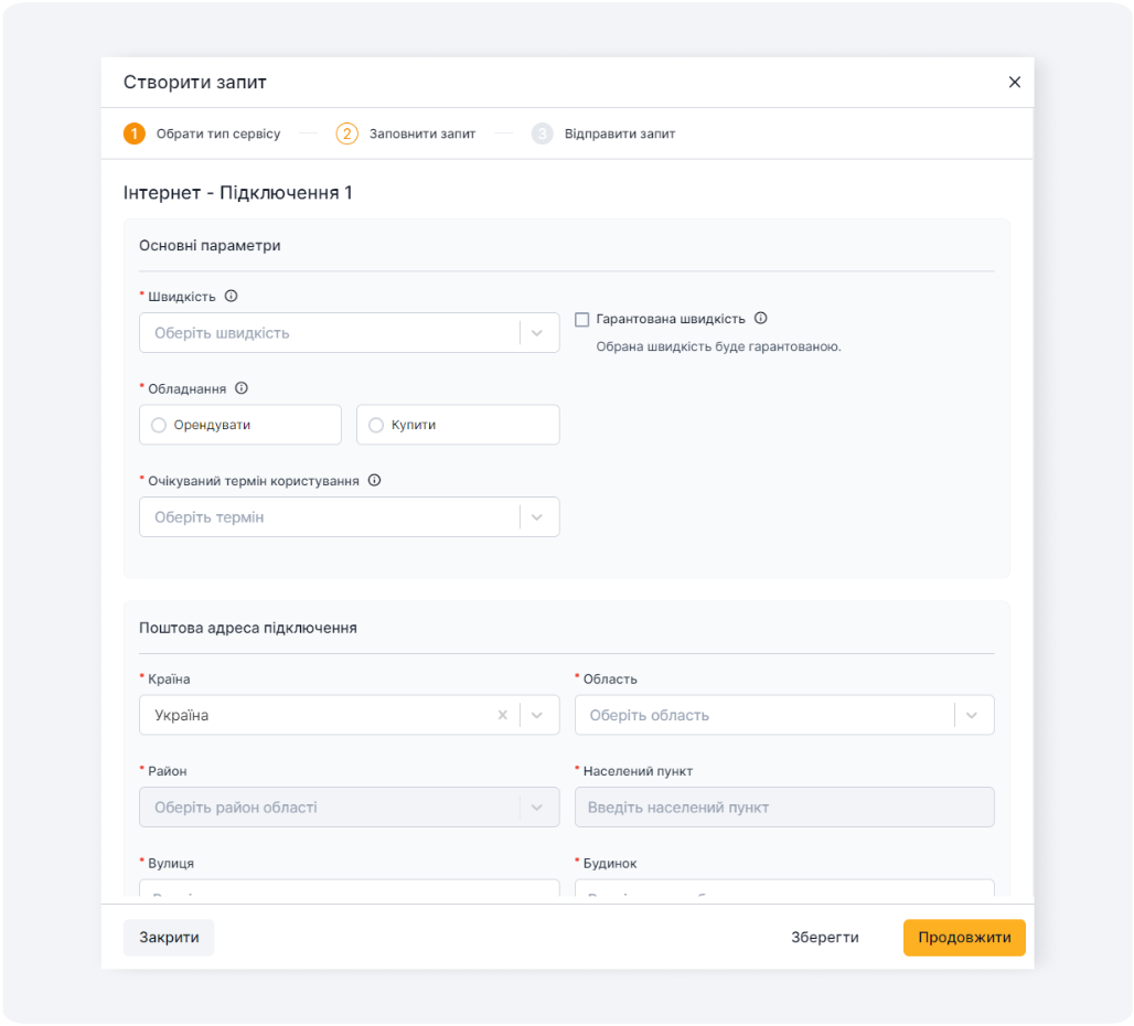 - Виберіть тип послуги, наприклад, «Інтернет для бізнесу».
