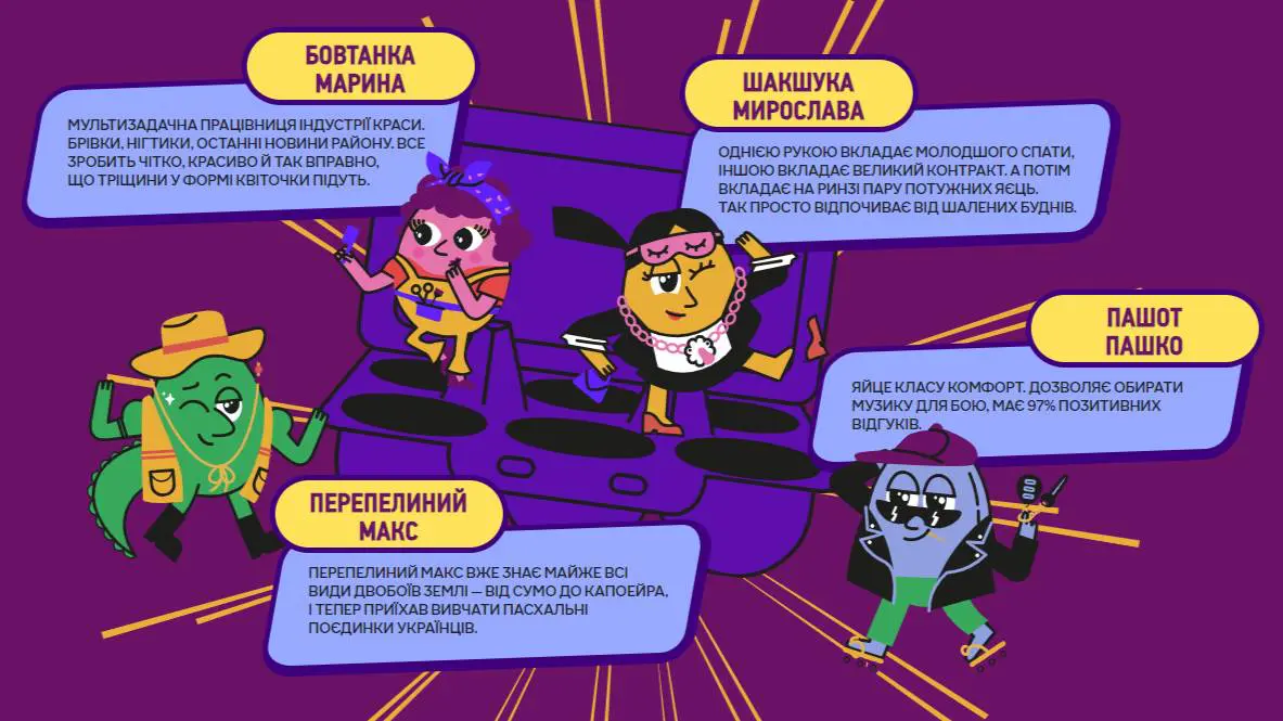 Графічний дизайнер Крутий Олег працює з дому й цілий рік накопичує потенціал для рингу, ФОП 3-ї групи Бовтанка Марина — мультизадачна працівниця індустрії краси, а мандрівник Перепелиний Макс знає майже всі види двобоїв — від сумо до капоейра, і тепер вивчає пасхальні поєдинки українців.