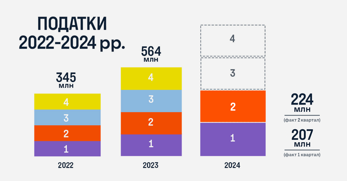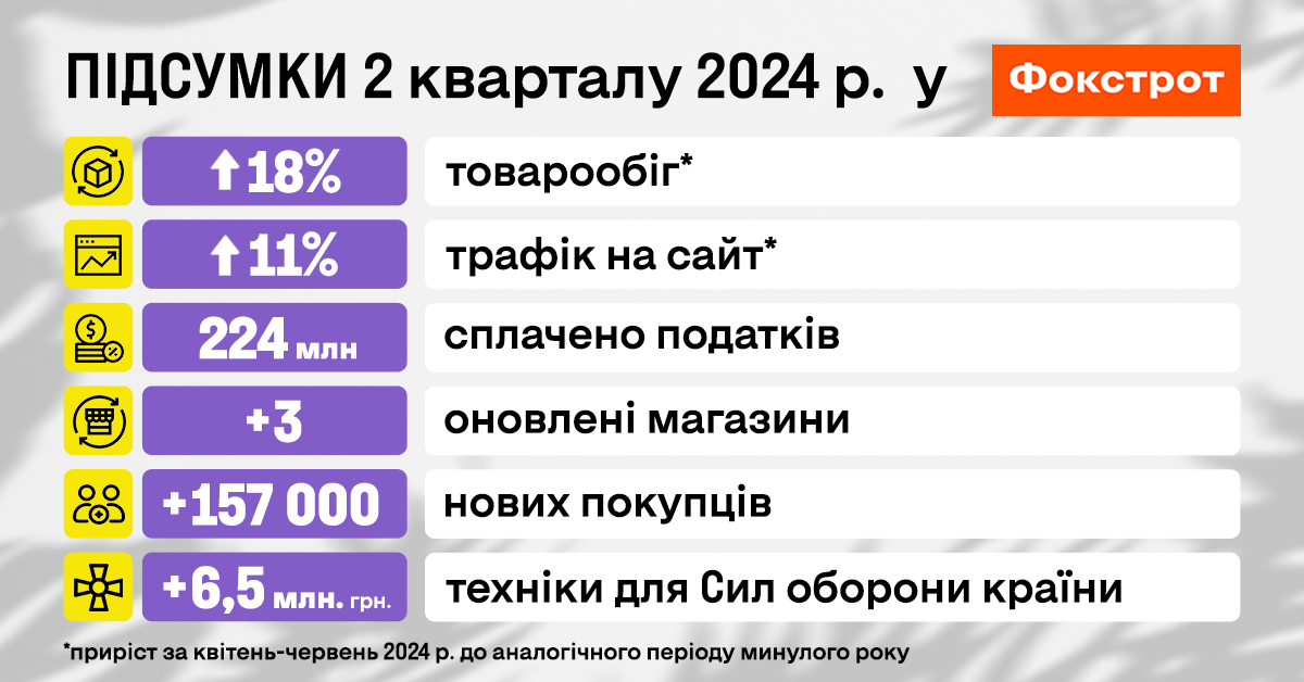 За другий квартал 2024 року Фокстрот сплатив 224 млн грн податків. Загальна сума за перше півріччя перевищує 430 млн грн, що складає 76% від повної тогорічної суми.