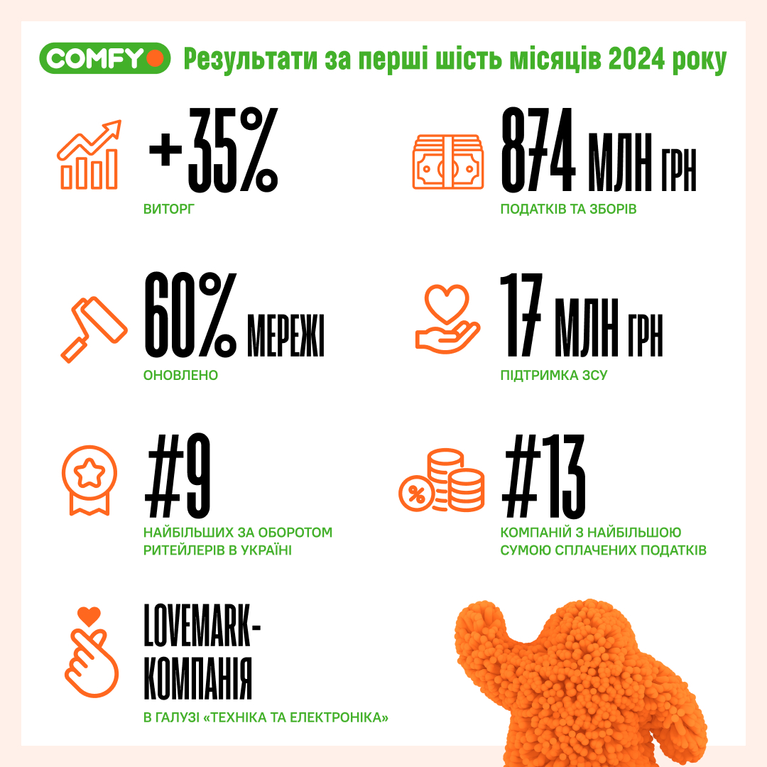 Підсумки роботи COMFY за перше півріччя 2024 року: понад 870 млн грн податків, оновлення 60% мережі та 17 млн грн на ЗСУ
