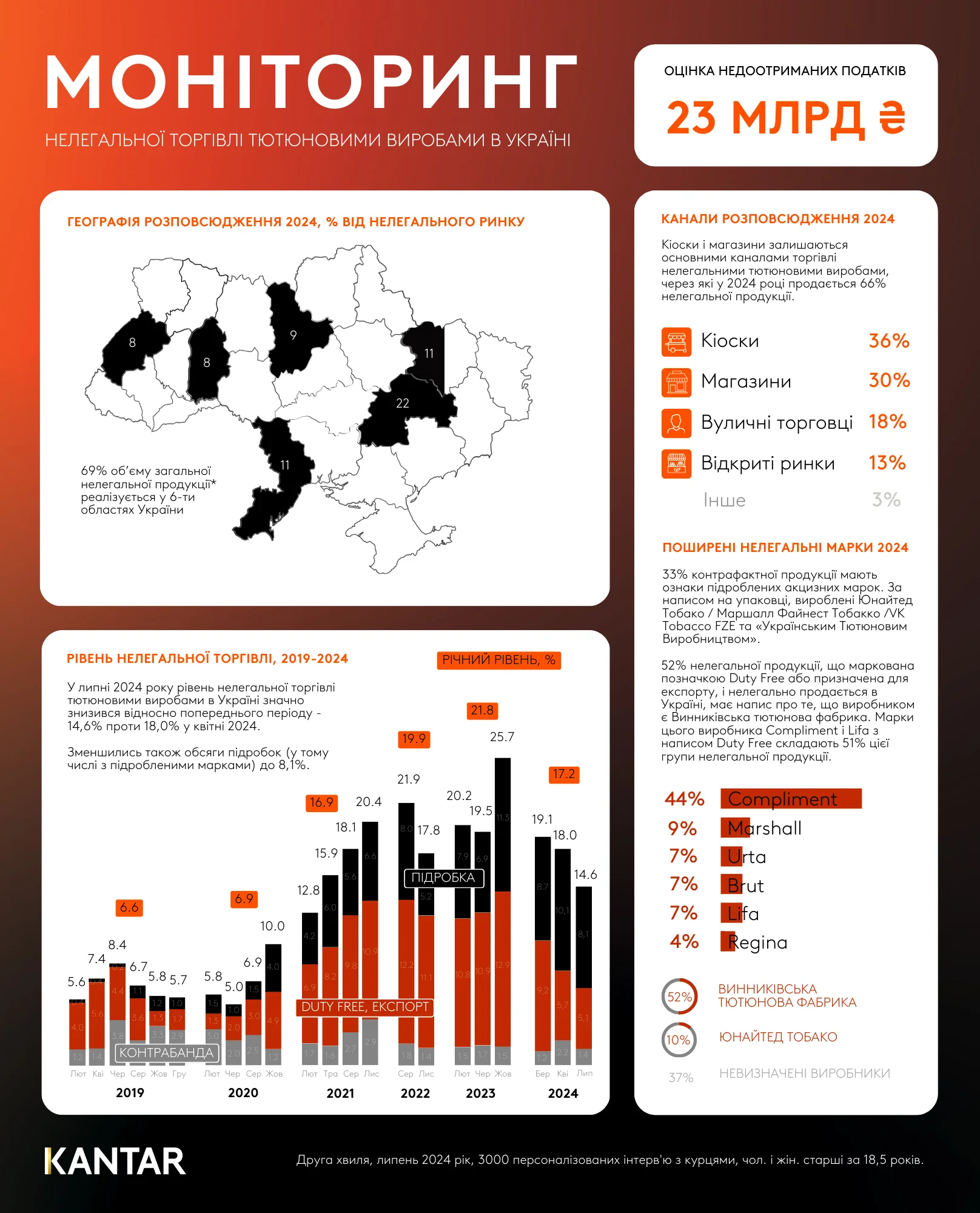 У липні 2024 року загальний рівень нелегальної торгівлі тютюновими виробами в Україні знизився до 14,6% (проти 19,1% на початку року і 18% у квітні 2024).