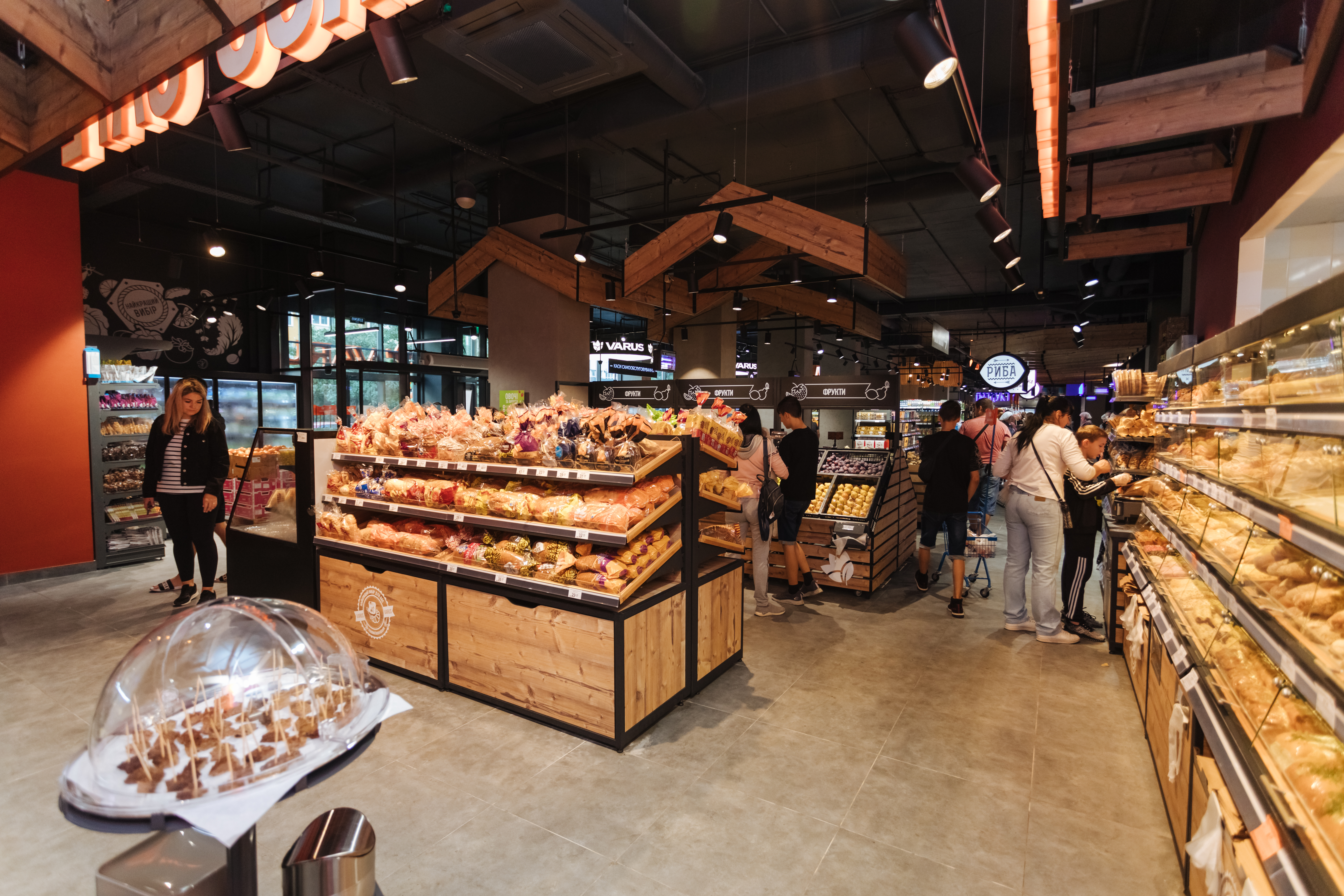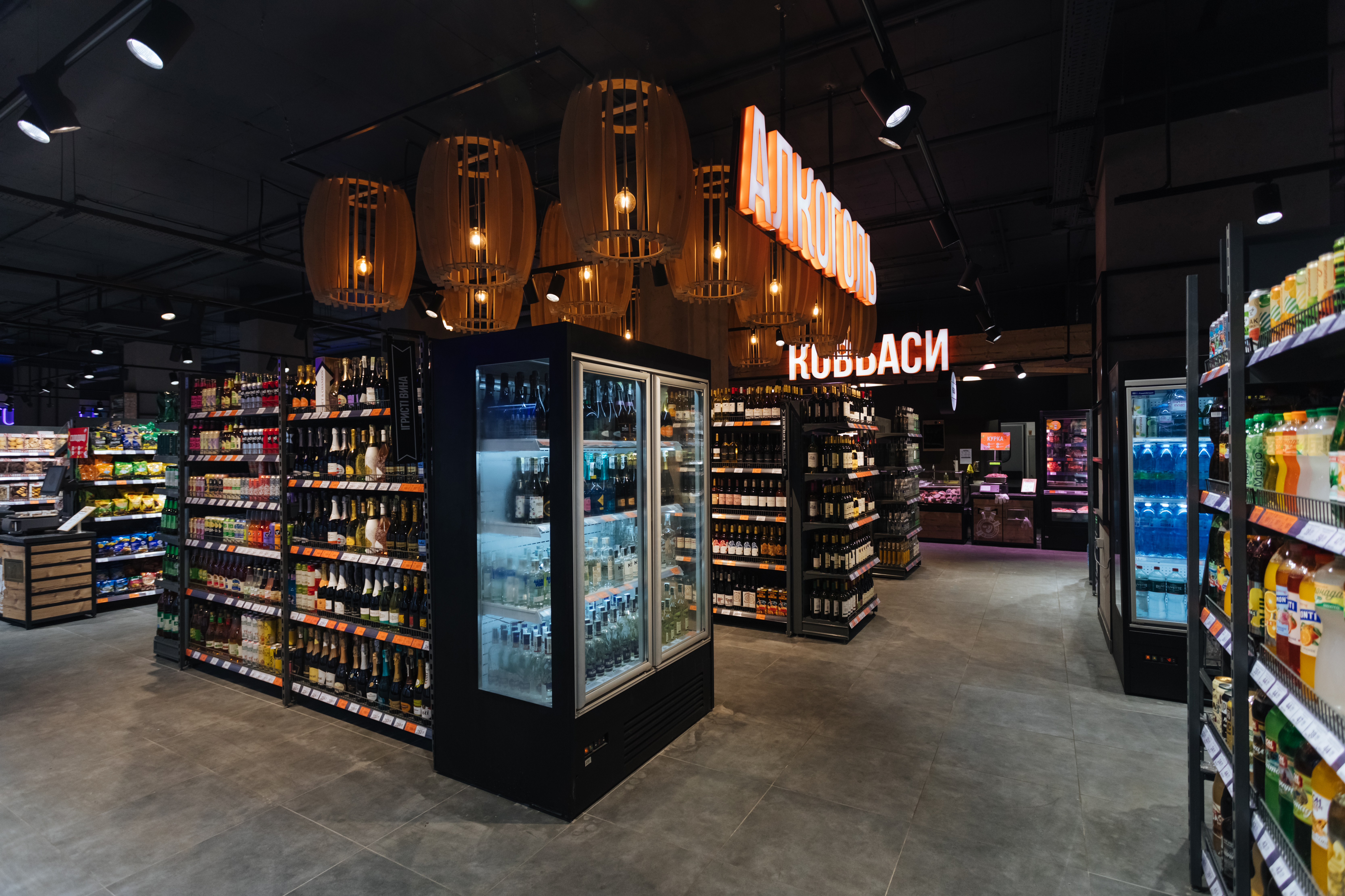 Солодощі представлені у затишній зоні з теплим освітленням, винний відділ прикрашений ліхтарями у формі бочок, а молочний та пивний відділи мають символічні конструкції у вигляді бідонів та кегів. Супермаркет VARUS має унікальний дизайн: відділи підсвічені неоновими вивісками, а на стінах розміщені стильні векторні принти.