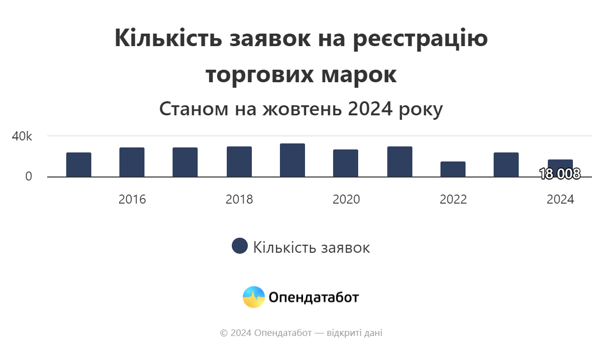 Вдруге кількість заявок на реєстрацію торгівельних марок різко скоротилася на початку повномасштабної війни: до 16 162. Це найнижчий показник за останні роки. Проте вже у 2023 році кількість заявок на реєстрацію торгових марок зросла до 25 тисяч, а з початку 2024 року вже подано 18 008 заявок за 9 місяців.