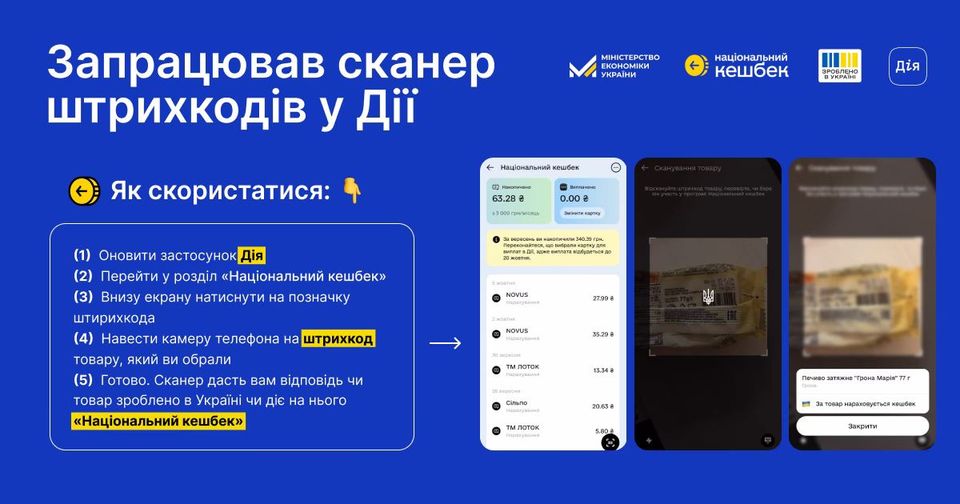 У застосунку Дія з’явилася нова функція — сканування штрих-кодів товарів. Вона допоможе перевірити, чи є товар справді українським і, чи бере він участь у програмі «Національний кешбек».