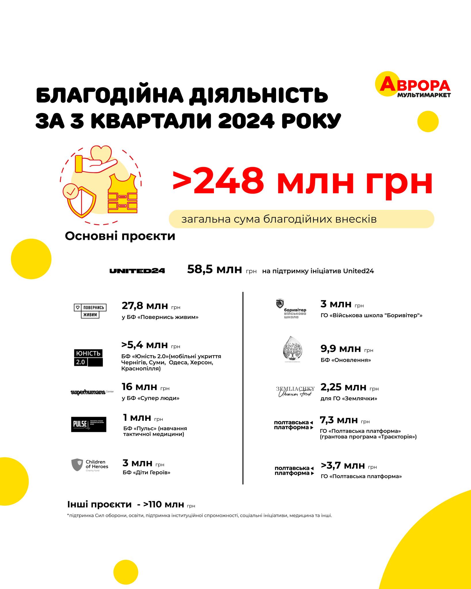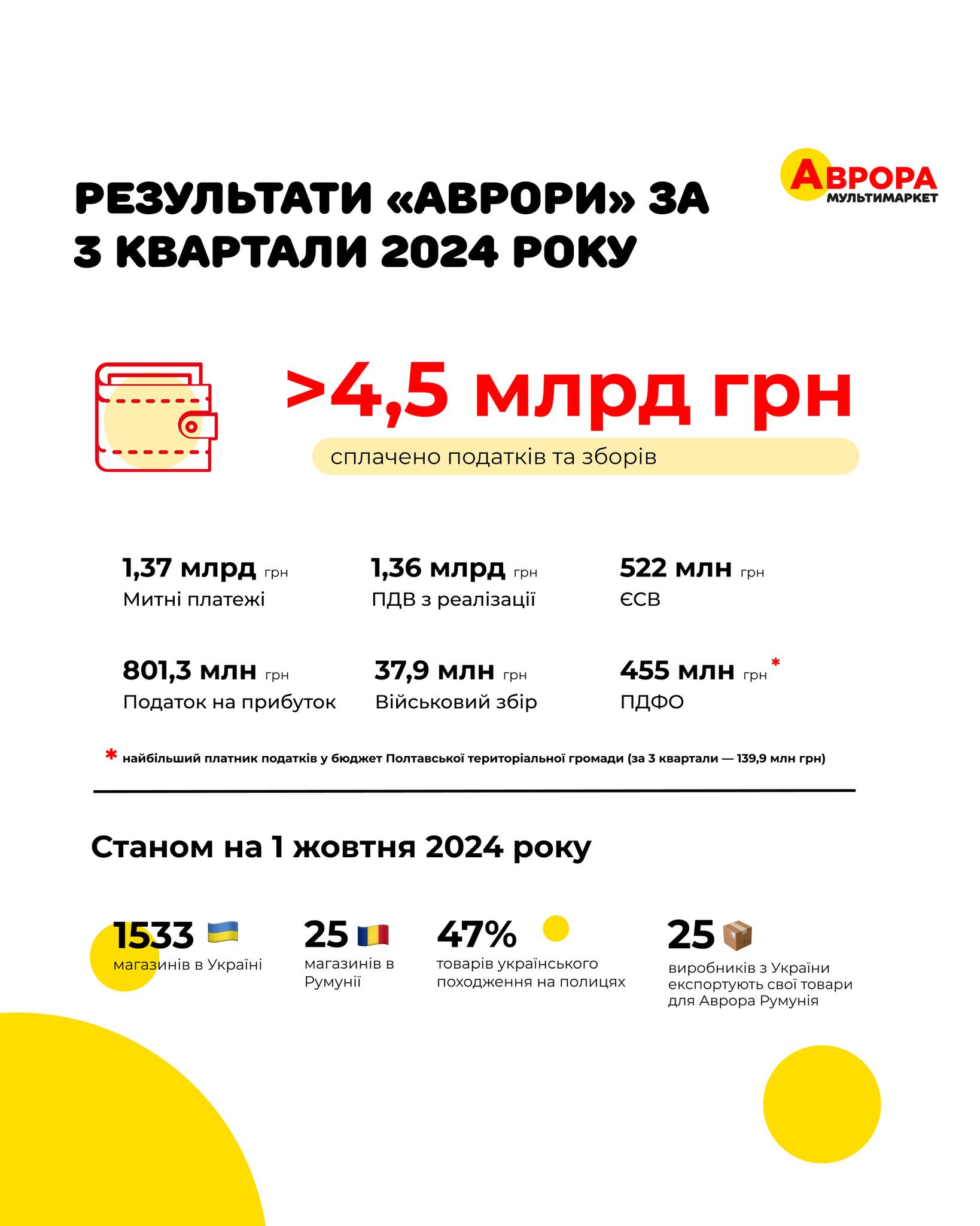 Із загальної суми сплачених податків 1,37 млрд грн склали митні платежі, 1,36 млрд грн — ПДВ із реалізації, 522 млн грн — єдиний соціальний внесок, 803,1 млн грн — податок на прибуток, 37,9 млн грн — військовий збір. За результатами трьох кварталів 2024 року мережа «Аврора» є найбільшим платником податків у Полтавській територіальній громаді — 139,9 млн грн.