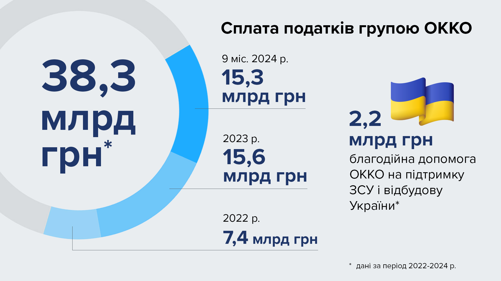 За січень-вересень 2024 року група компаній ОККО сплатила 15,308 мільярда гривень податків і зборів. Це майже на 5 мільярдів гривень, або на 48%, більше, ніж за аналогічний період торік.