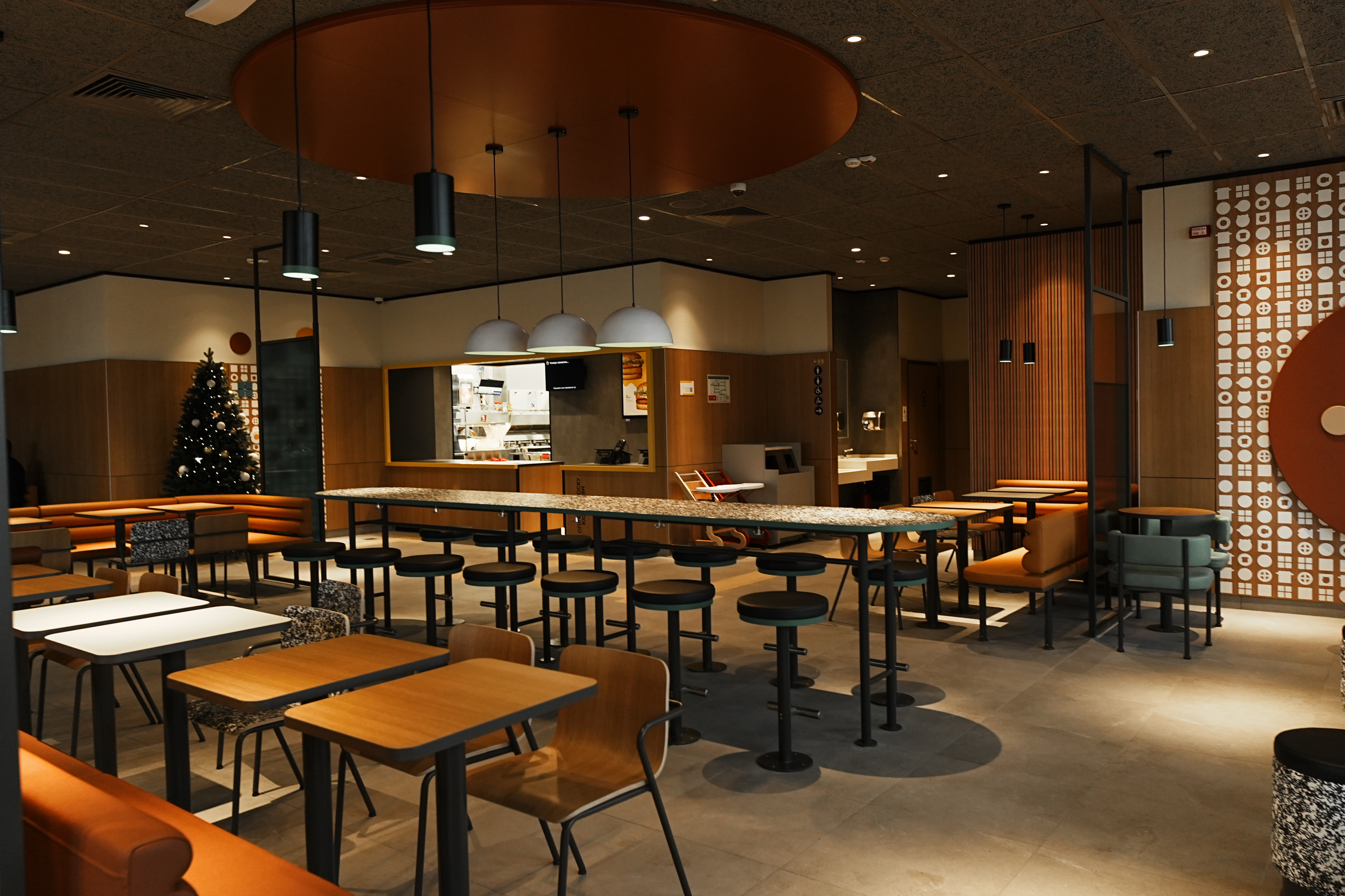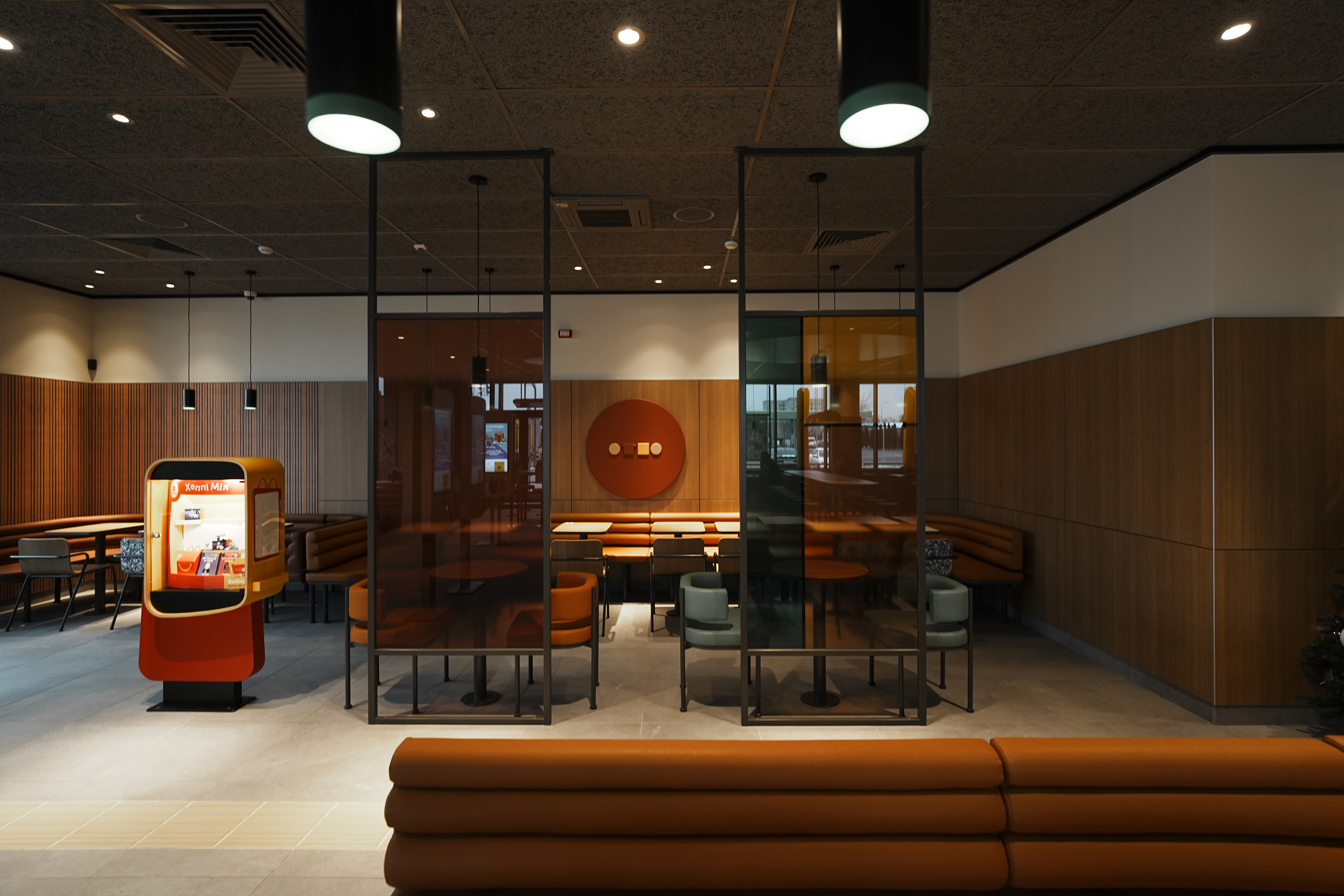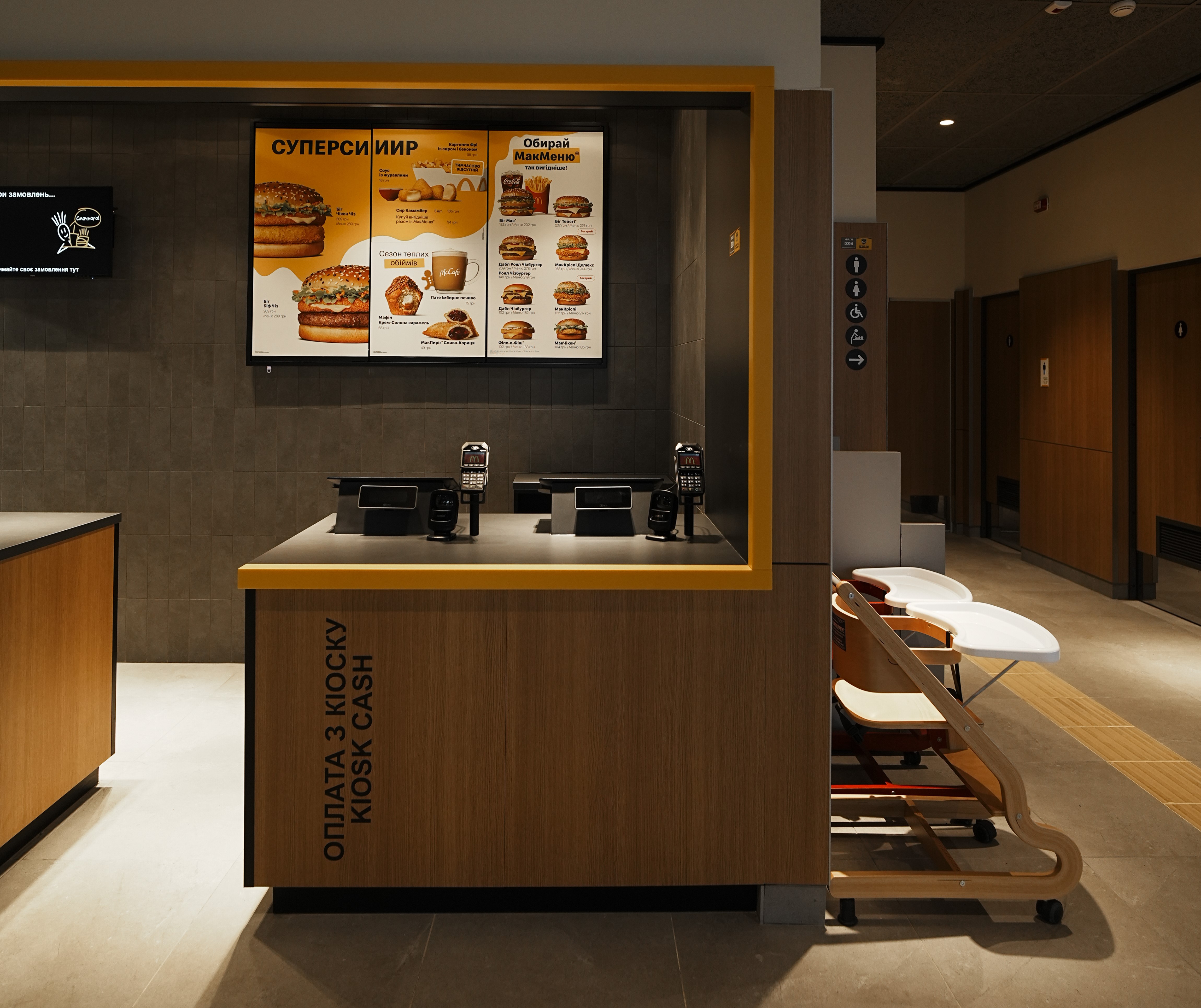 У просторому закладі площею 469 м² гості можуть розміститися в залі на 128 місць або на терасі на 126 місць. Ресторан працюватиме з 7:00 до 23:00: тут доступні швидке та безконтактне замовлення на терміналах самообслуговування та замовлення на касі у працівників закладу.