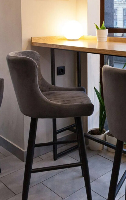 Високі барні стільці — ідеальний варіант. Вони можуть бути з м’яким сидінням, високою спинкою, підніжками й підлокітниками. При виборі важливо врахувати висоту барної стійки і комфорт використання.