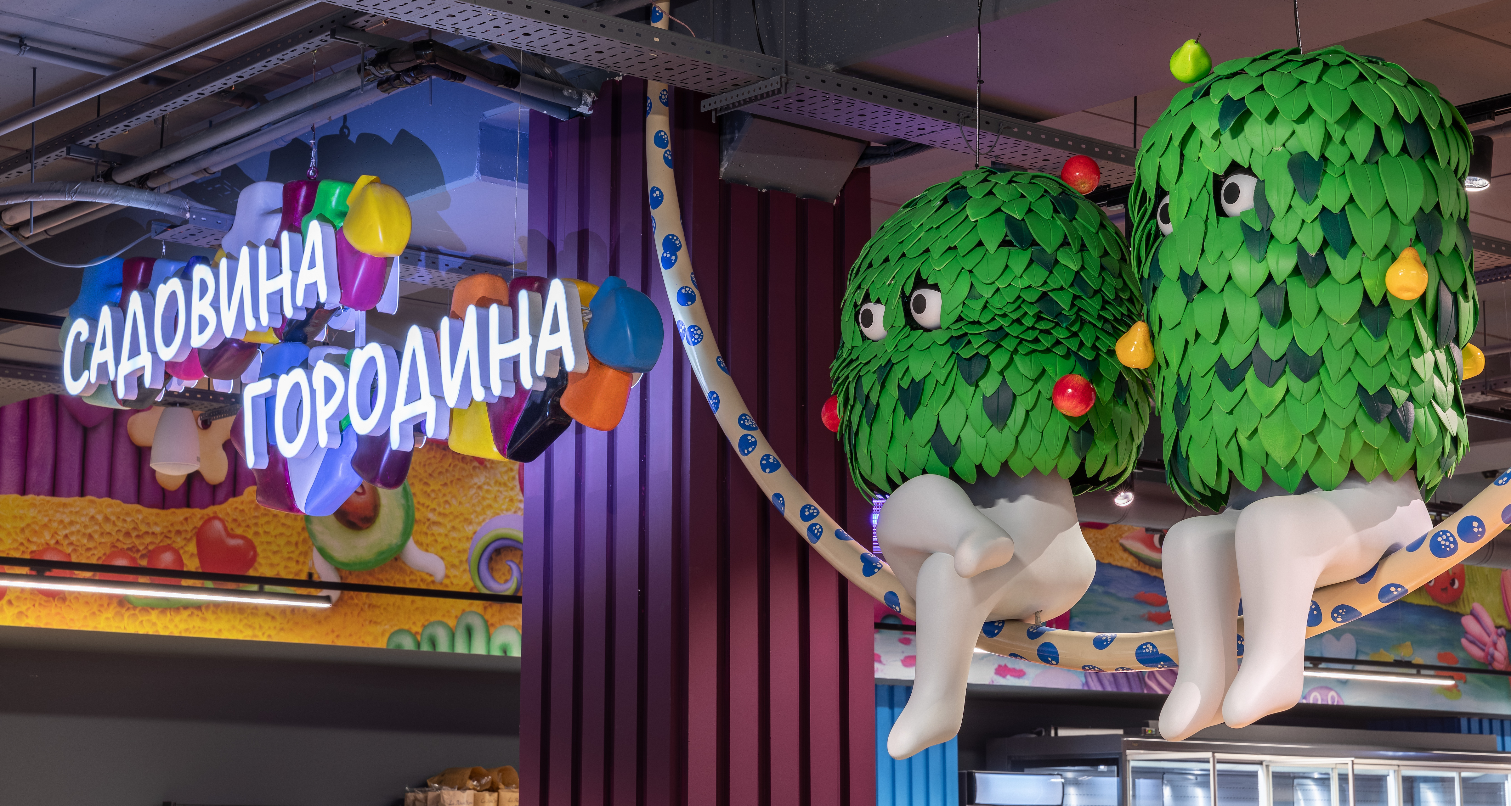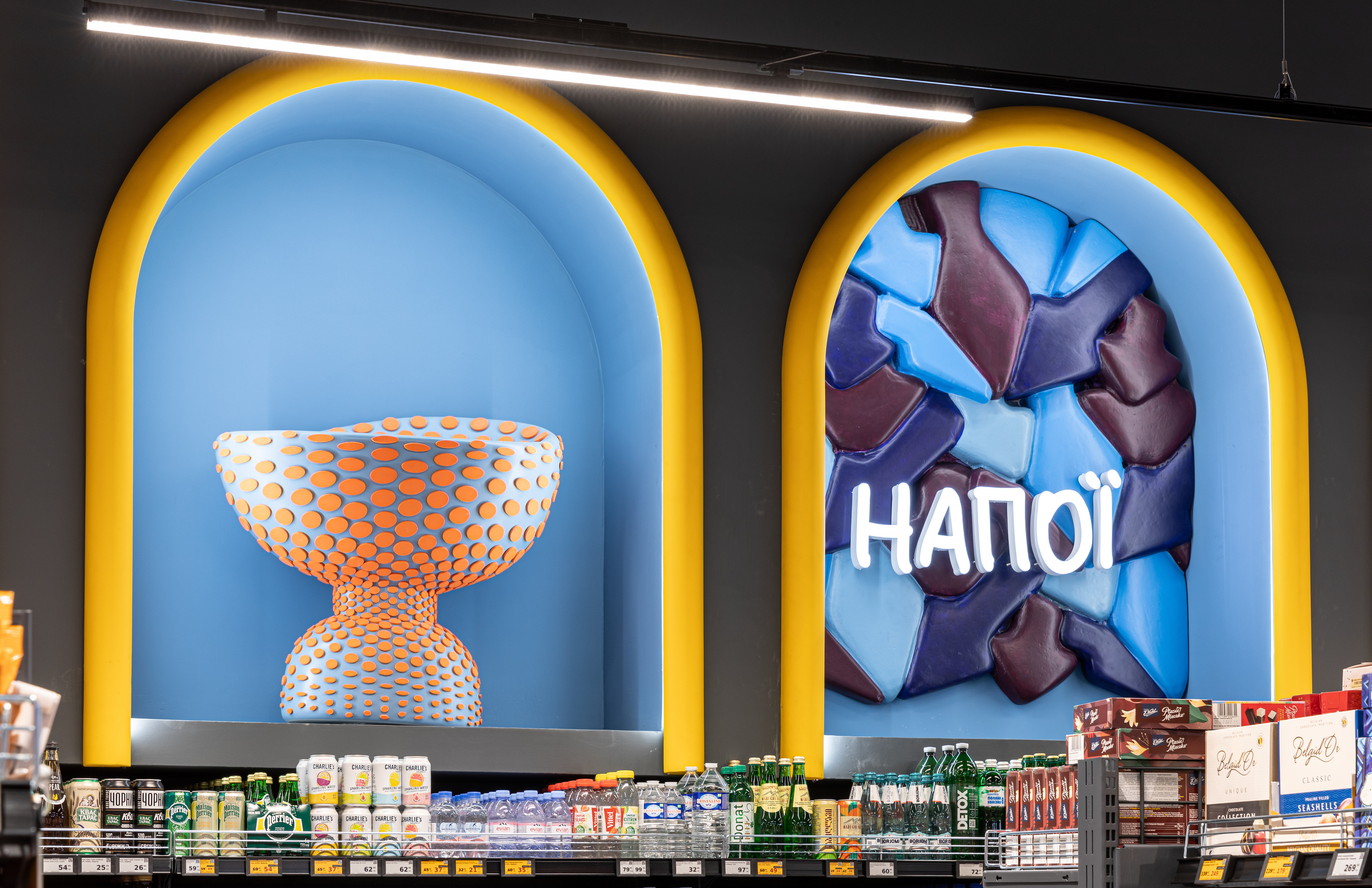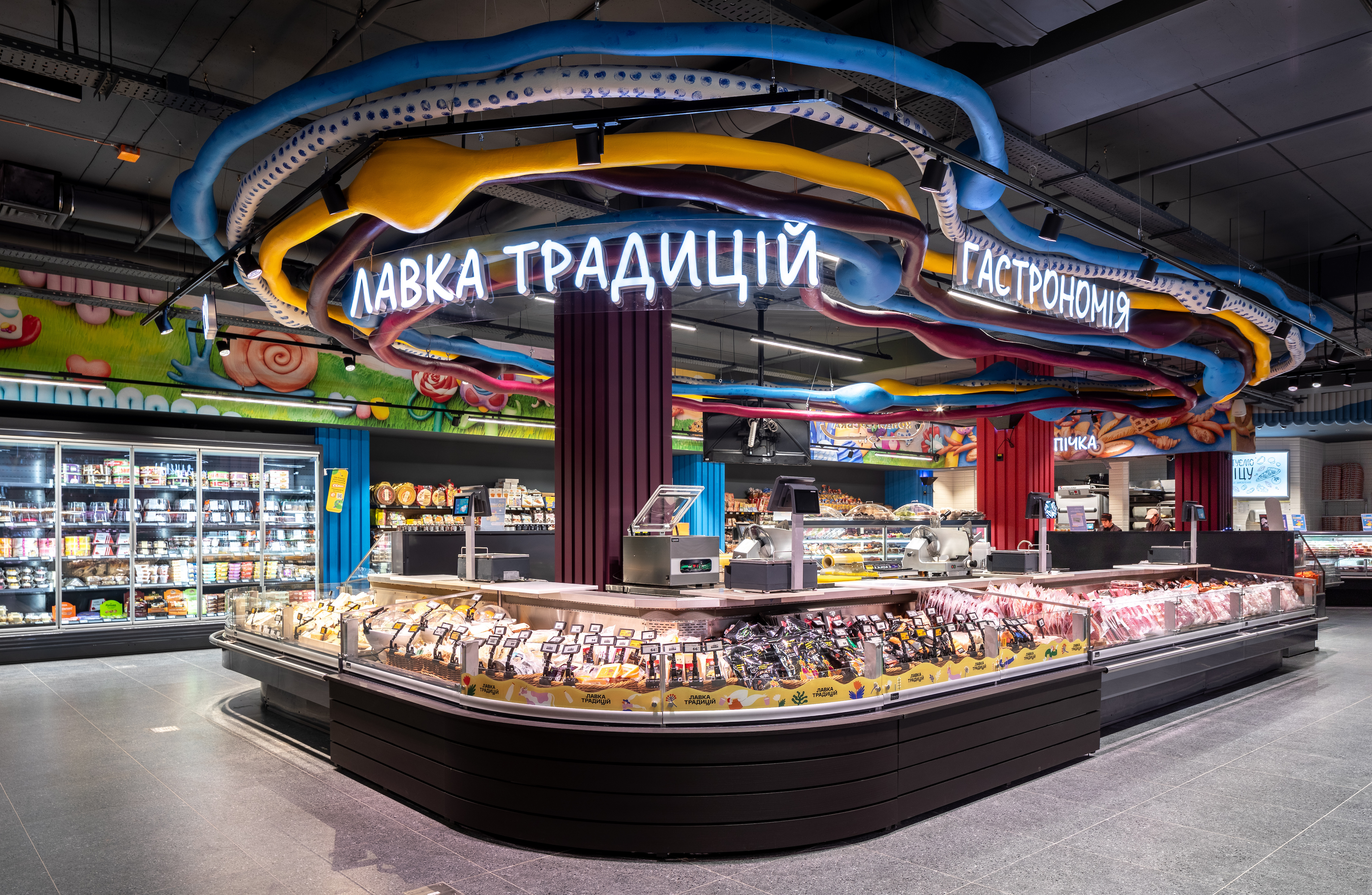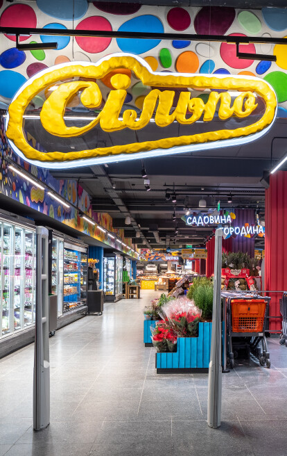 Плавні лінії, яскраві кольори та текстури оживляють простір. Колони нагадують бруски пластиліну, які натякають: можна зліпити, що забажаєте, все у ваших руках. У зоні овочів і фруктів яблучка підморгують уважним гостям, а виліплені вручну шпалери розповідають історії світотворення. У зоні напоїв та алкоголю атмосфера змінюється — панує стримана елегантність з абстрактними формами та насиченими кольорами.