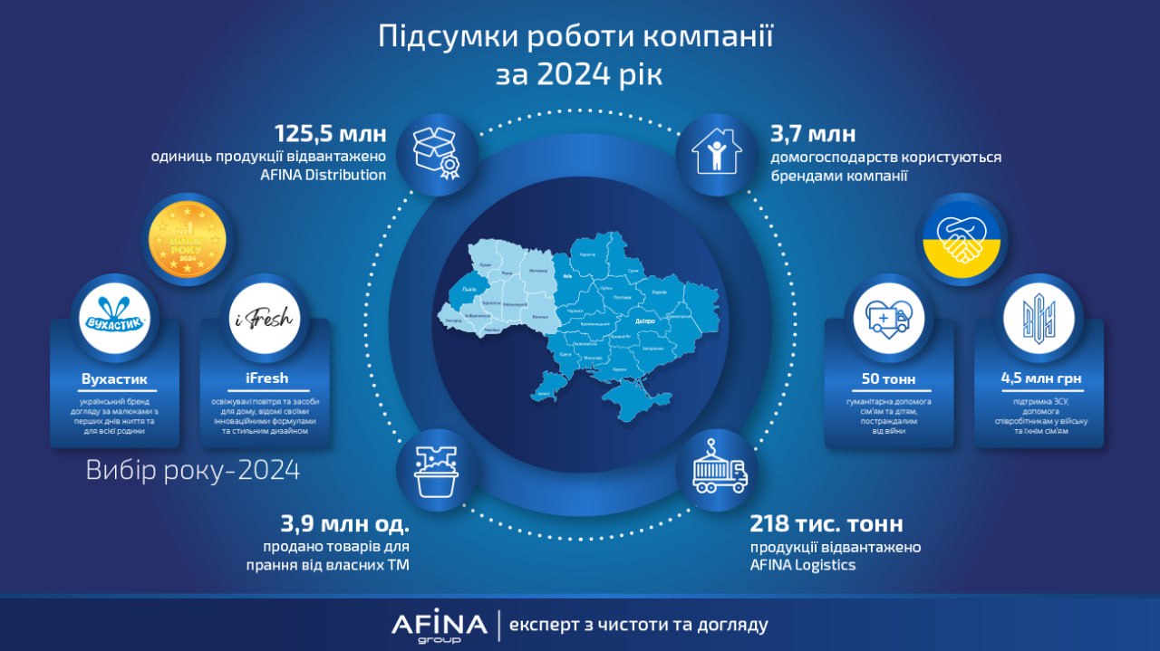 Серед важливих досягнень року — відкриття нового сучасного складу у Києві та запуск філії й складу у Львові, а також перемога у премії «Вибір року-2024», яку здобули бренди «Вухастик» та iFresh. Крім того, компанія отримала сертифікати ISO 9001:2015 та ISO 28000:2007, що підтвердило її відповідність міжнародним стандартам якості та безпеки. Ці здобутки стали можливими завдяки цілеспрямованій стратегії розвитку, інвестиціям у сучасні технології та постійному вдосконаленню процесів, що дозволяє компанії AFINA Group залишатися на лідерських позиціях у своїй галузі.