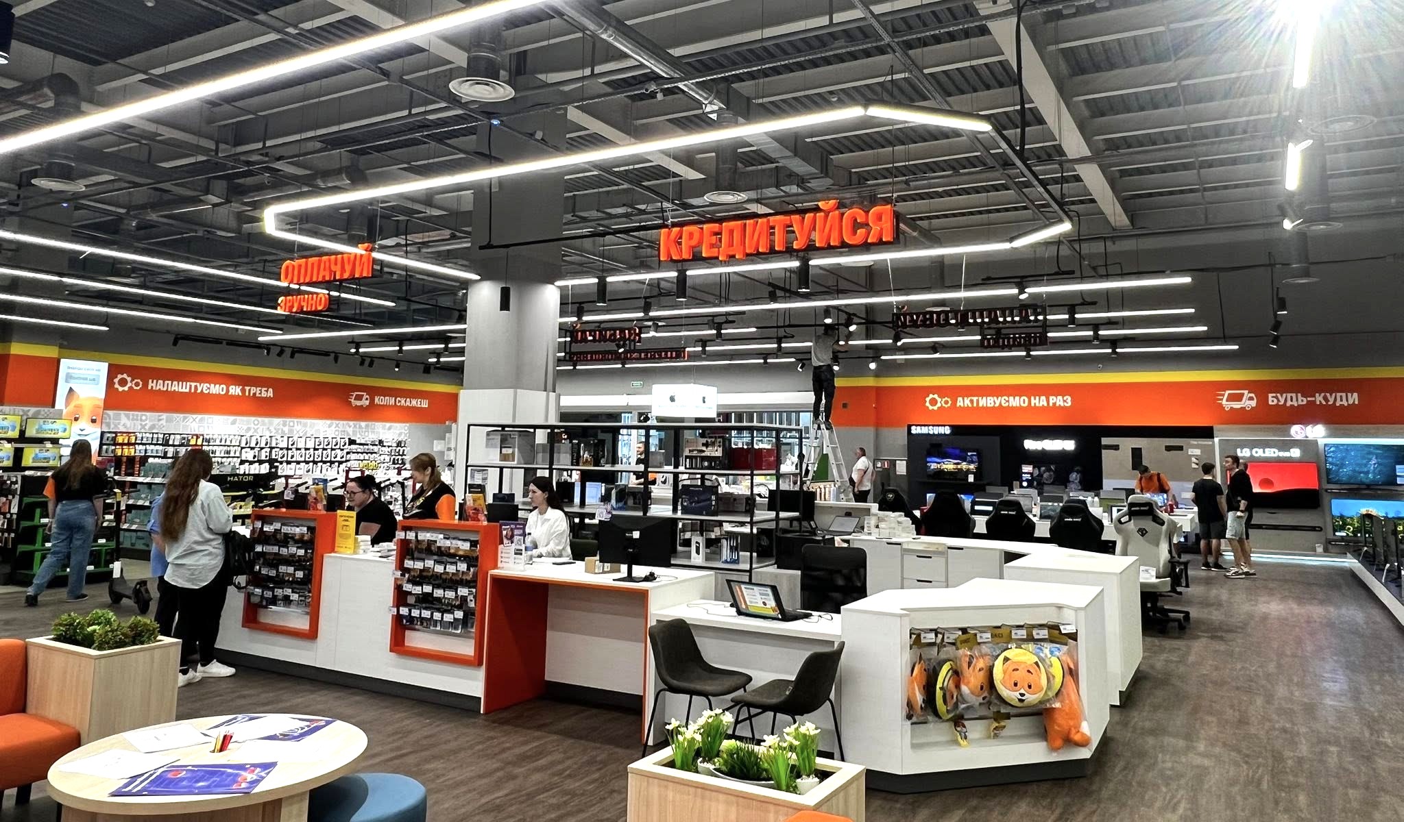 В асортименті — розгалужений вибір топових товарів і технологічних новинок від популярних виробників. У торговій залі облаштовано бренд-зони Samsung, Xiaomi, LG, Philips, Delonghi, Tefal, Krups та інших, де клієнти можуть ознайомитися з технікою та протестувати її перед покупкою. Для комфорту відвідувачів облаштовано лаундж-зону з можливістю підзарядити гаджети, відпочити, а для найменших гостей — затишне місце для малювання.