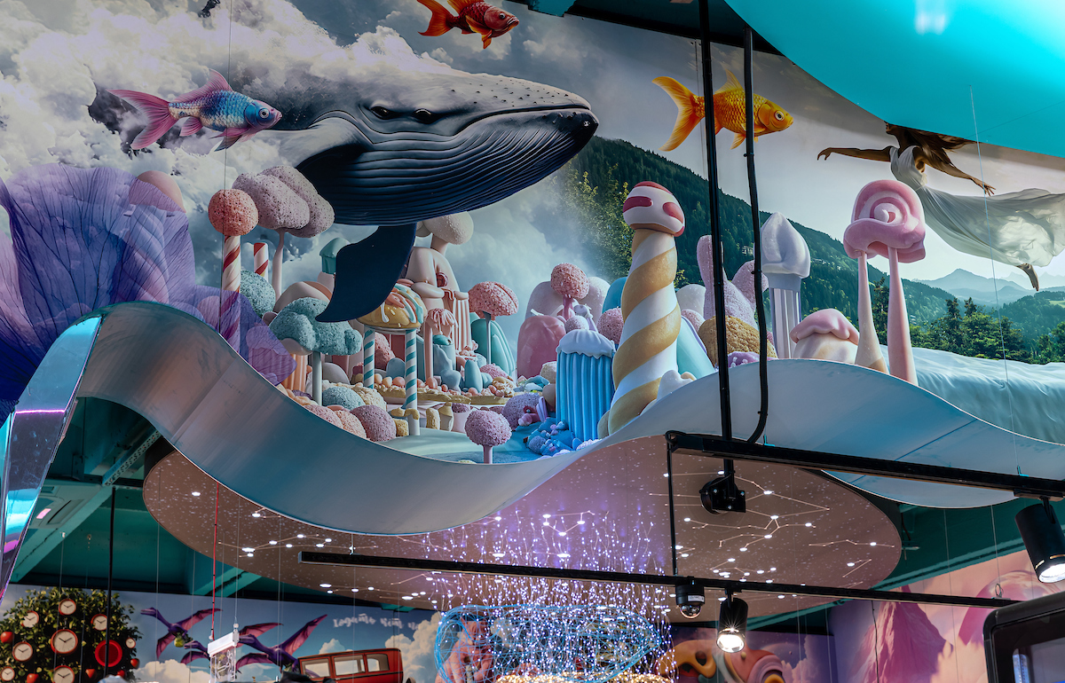 Дизайн поєднує у собі сюрреалізм і фентезі. Барвисті та чіткі елементи чергуються з розмитими та химерними образами — це допомагає передати відчуття сновидінь та підсвідомих символів. У просторі нового магазину нічого не є буквальною репрезентацією — усе заграє з метафорами: дзеркальний фасад — вхід у сон, зайчик на банані — абсурдна нічна алюзія, а каси з овечками — зона пробудження.