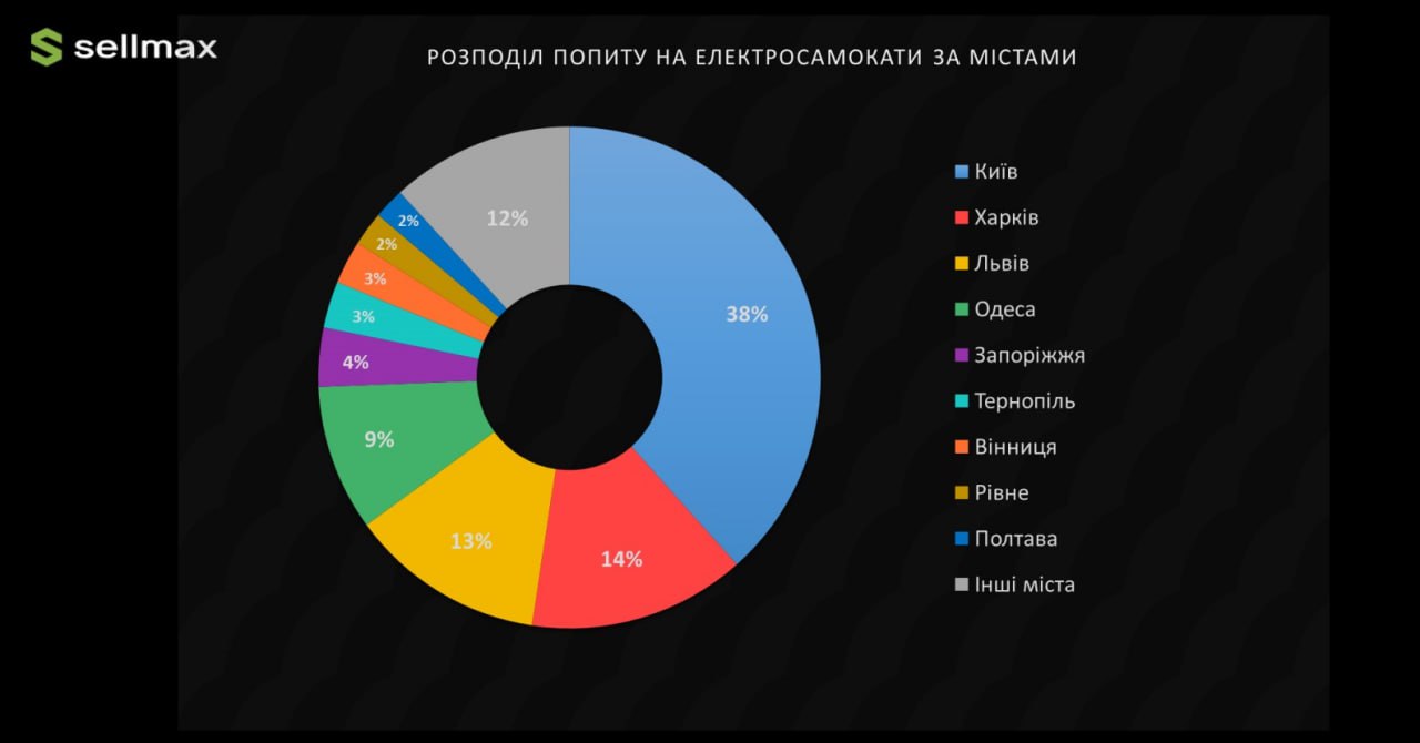 Найбільше запитів на електросамокати зафіксовано у Києві, Львові, Харкові та Одесі — понад 70% всього обсягу пошуку припадає на ці чотири міста. Це свідчить про високий попит у великих урбанізованих центрах.