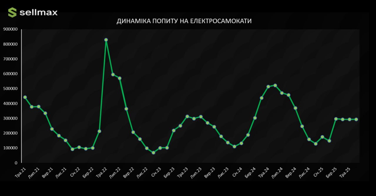 «Якщо пік попиту у 2022 році був відповіддю на дефіцит пального, то у 2024–2025 ми бачимо стабільний органічний попит. Водночас попит на електросамокати в Інтернеті демонструє чітку сезонну динаміку з піковими значеннями у весняно-літній період», — говорять в аналітичному центрі.