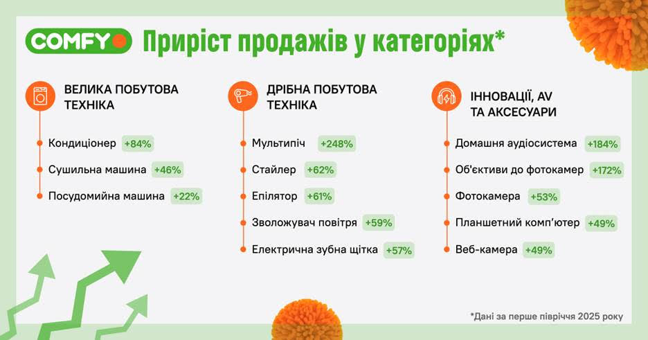 У першому півріччі 2025 року команда COMFY зафіксувала впевнене зростання попиту майже у всіх категоріях техніки. Найбільше — у дрібній побутовій техніці із середнім приростом +32% та аксесуарах +34%, що знову очолили список «хітів продажів». Лідерами є мультипечі, продажі яких залишаються стабільно високими — +248,1% до показників першого півріччя 2024 року. До топу товарів увійшли зволожувачі повітря (+59%), кавомашини (+40%) та пароочисники (+37%).