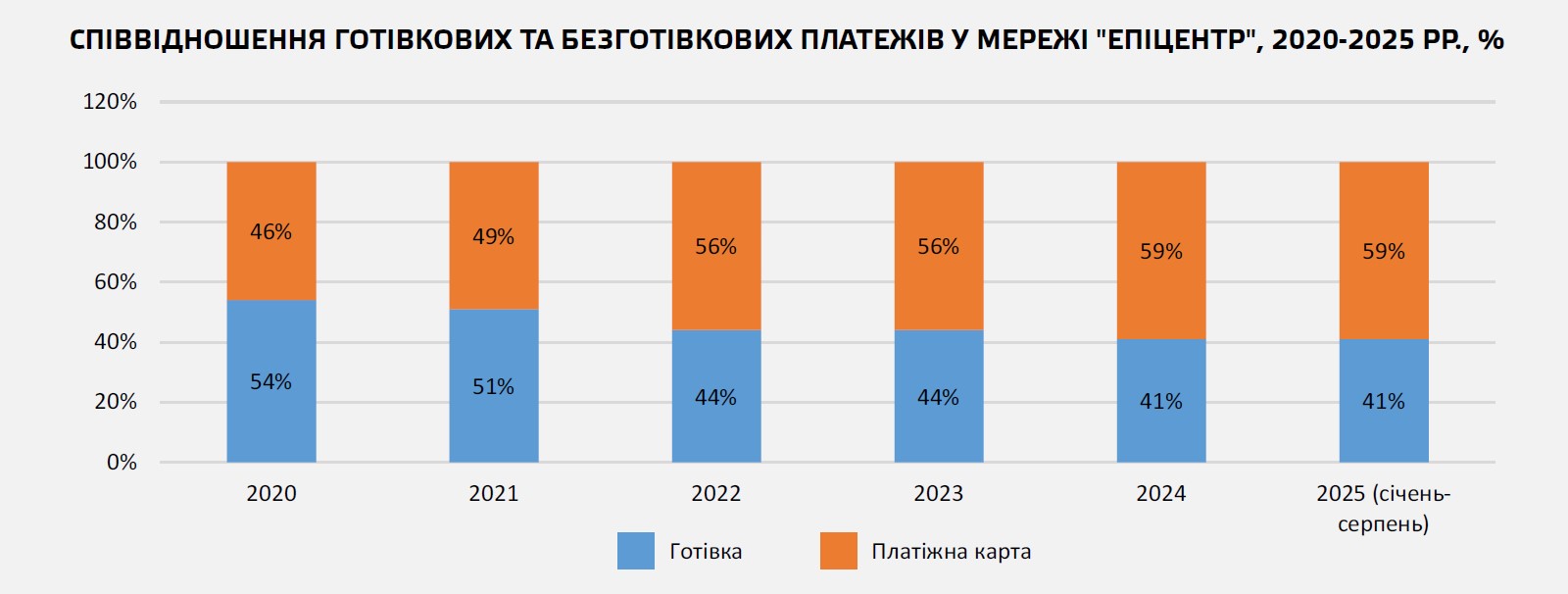 - «Епіцентр» - частка безготівкових розрахунків складає 59%, частка готівки – 41%.