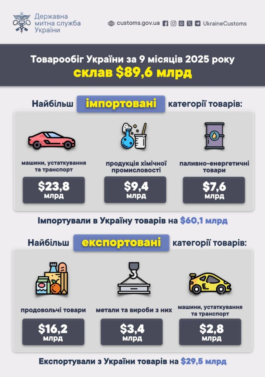 За дев'ять місяців 2025 року товарообіг України склав 89,6 млрд доларів. Протягом січня-вересня 2025 року в Україну імпортували товарів на суму 60,1 млрд дол., а експортували – на 29,5 млрд дол.