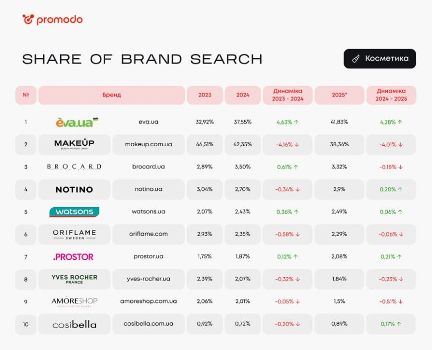Найбільше споживачі шукають бренди EVA, Makeup і Brocard через Google в категорії «Косметика». На перші дві з них припадає 80% всього брендового трафіку.