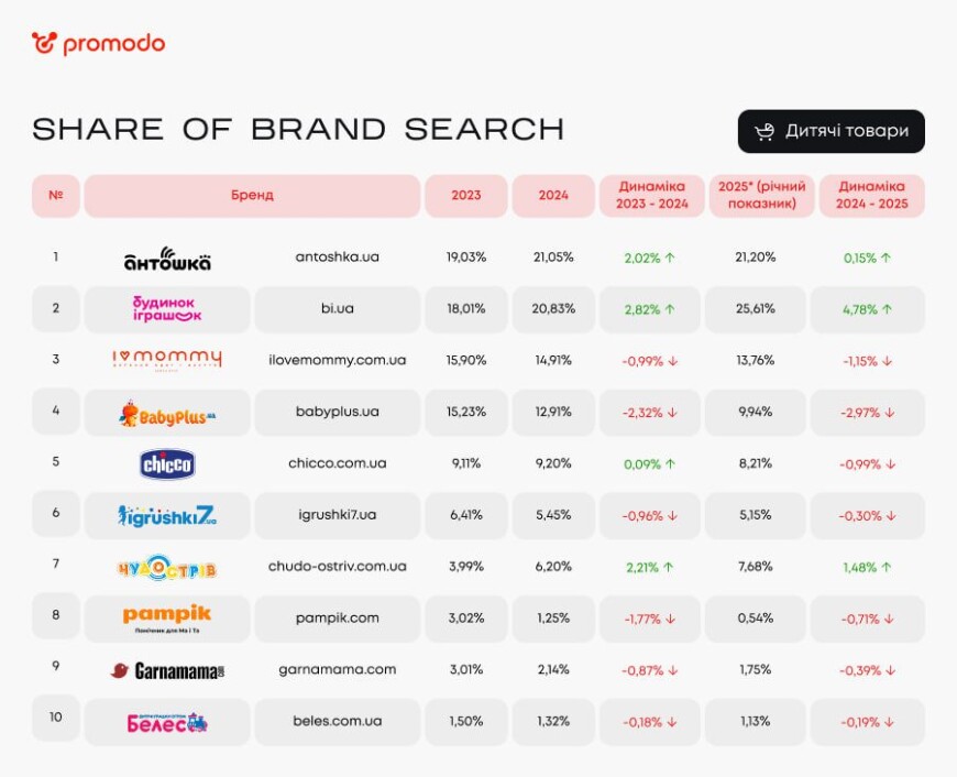 В сегменті «Зоотовари» — MasterZoo, Pethouse та Purina, на яких припадає понад 50% трафіку. В категорії «Дитячі товари» — «Будинок Іграшок», «Антошка» та I Love Mommy (понад 50%).