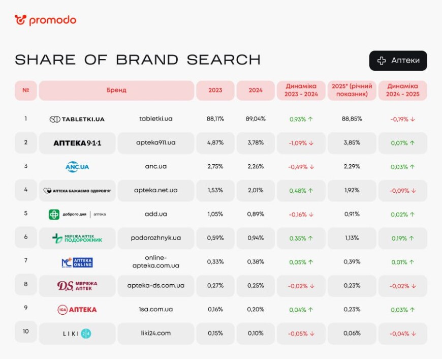 Лідери в сегменті «Аптеки» — мережі «Аптека 9-1-1», «Аптеки АНЦ» та «Аптека Бажаємо Здоровʼя». На них припадає майже 70% всіх запитів брендів. З урахуванням прайс-агрегаторів — першість за Tabletki.ua.