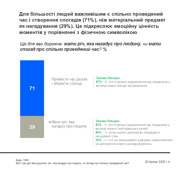 Близько 71% опитаних українців надають перевагу спільно проведеному часу та новим враженням, тоді як лише 29% вважають важливішим мати річ як нагадування про подію чи людину.