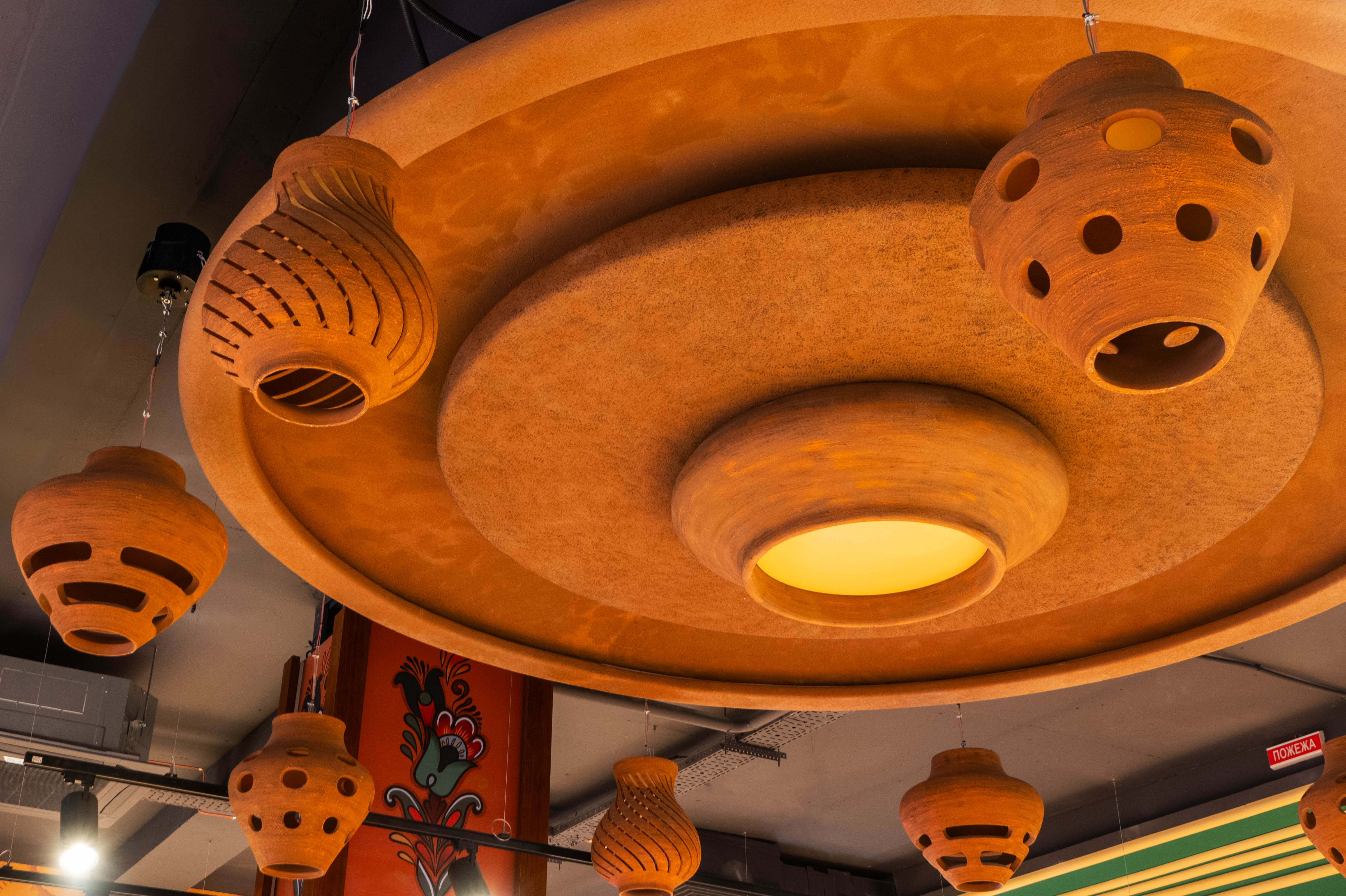 Одразу біля входу гостей зустрічають впізнавані силуети півників, доповнені колонами-глечиками з авторським ручним розписом. Мотиви васильківської майоліки простежуються як у декоративних фігурах, так і у візерунках, що формують загальну стилістику простору. Над відділом овочів та фруктів розташовано кінетичний артоб’єкт — гончарне коло, що обертається, оточене підсвіченими глечиками.
