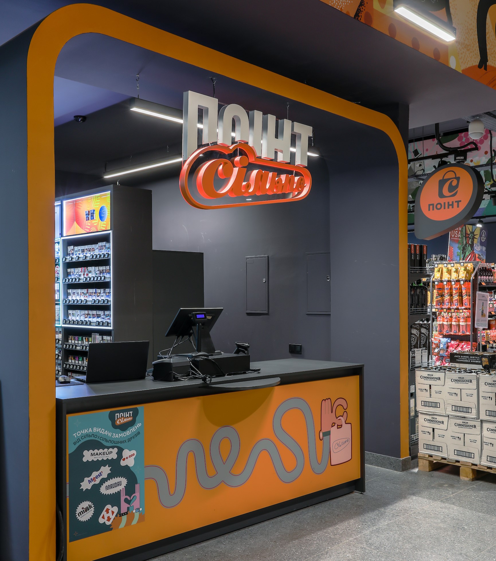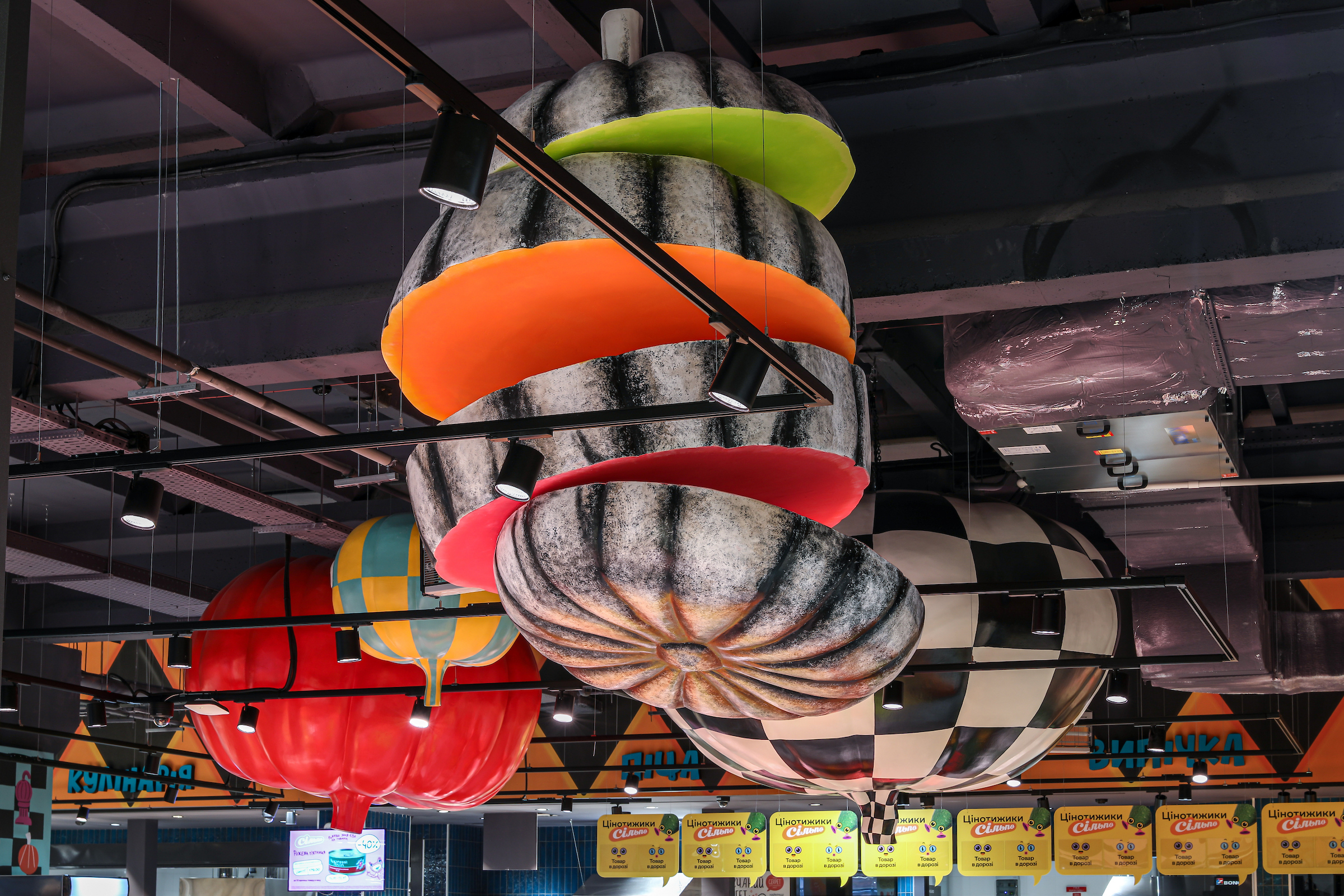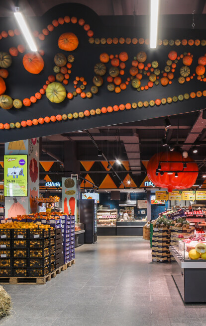 Перше, що бачать гості, — вивіску «Сільпо», складену з десятків маленьких гарбузиків. Під стелею розмістилися великі об’ємні декорації, що створюють атмосферу осіннього ярмарку. Особливий акцент — артоб’єкт у вигляді чорно-білого гарбуза з кольоровим розрізом, який додає простору виразності та глибини.