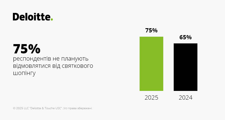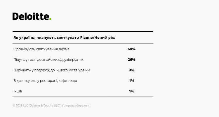 Попри четвертий рік повномасштабної війни, підготовка до зимових свят залишається важливим елементом життя для багатьох українців. За даними Deloitte Ukraine, кількість тих, хто планує різдвяний та новорічний шопінг, за рік зросла з 65% до 75%. Все більше українців також обирають домашній формат святкування – 68% проти 54% у 2024 році.