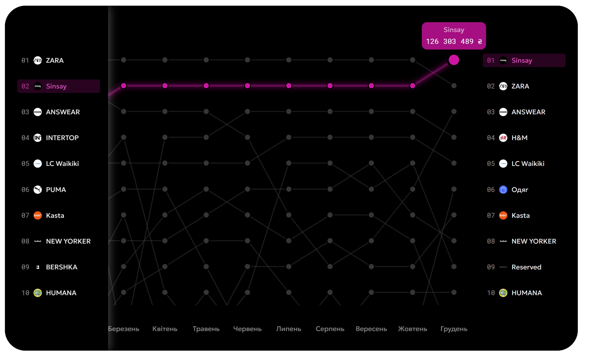 Згідно з даними дашборду від Monobank, Sinsay посідає перше місце, з помітним стрибком обороту в порівнянні з попередніми місяцями.