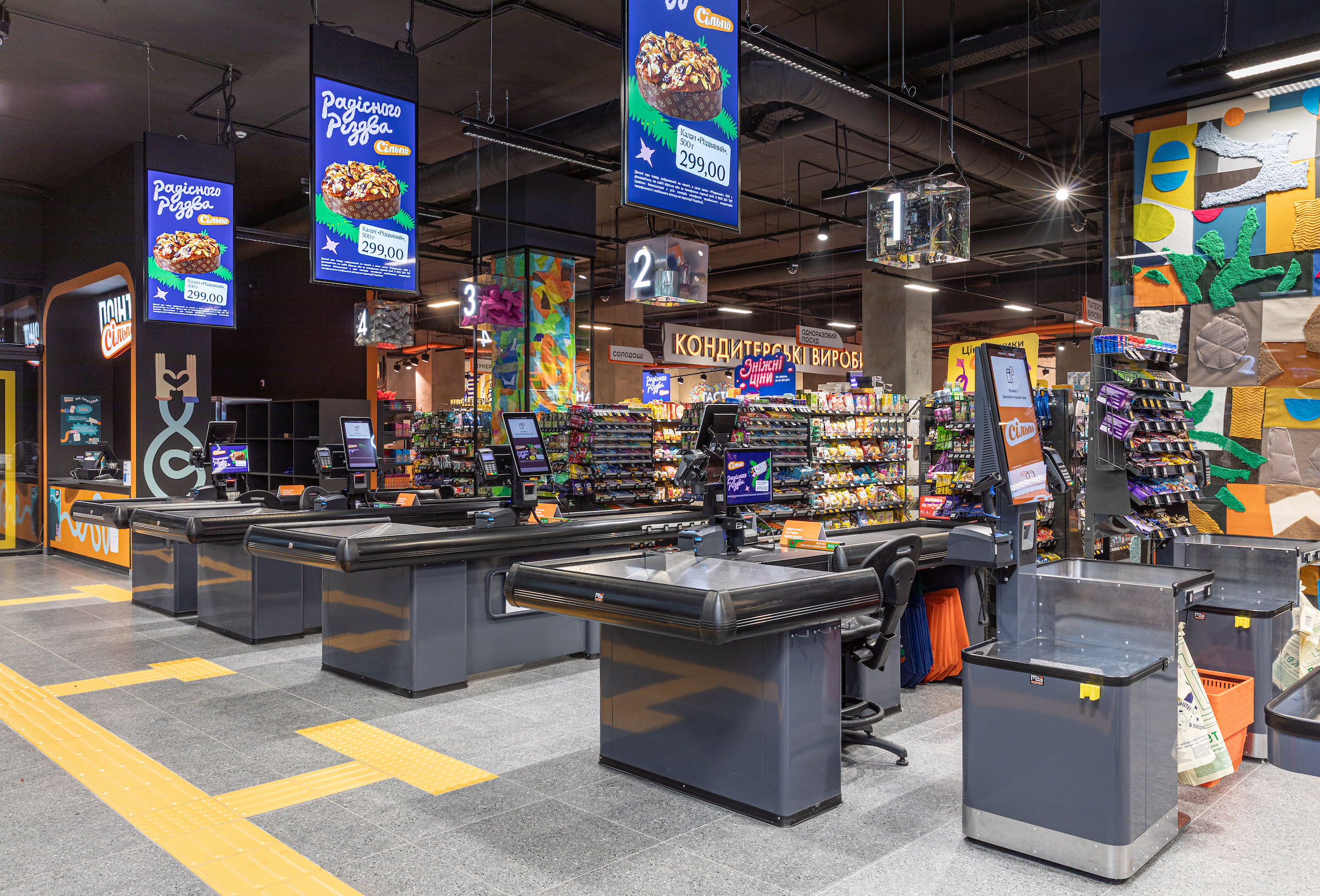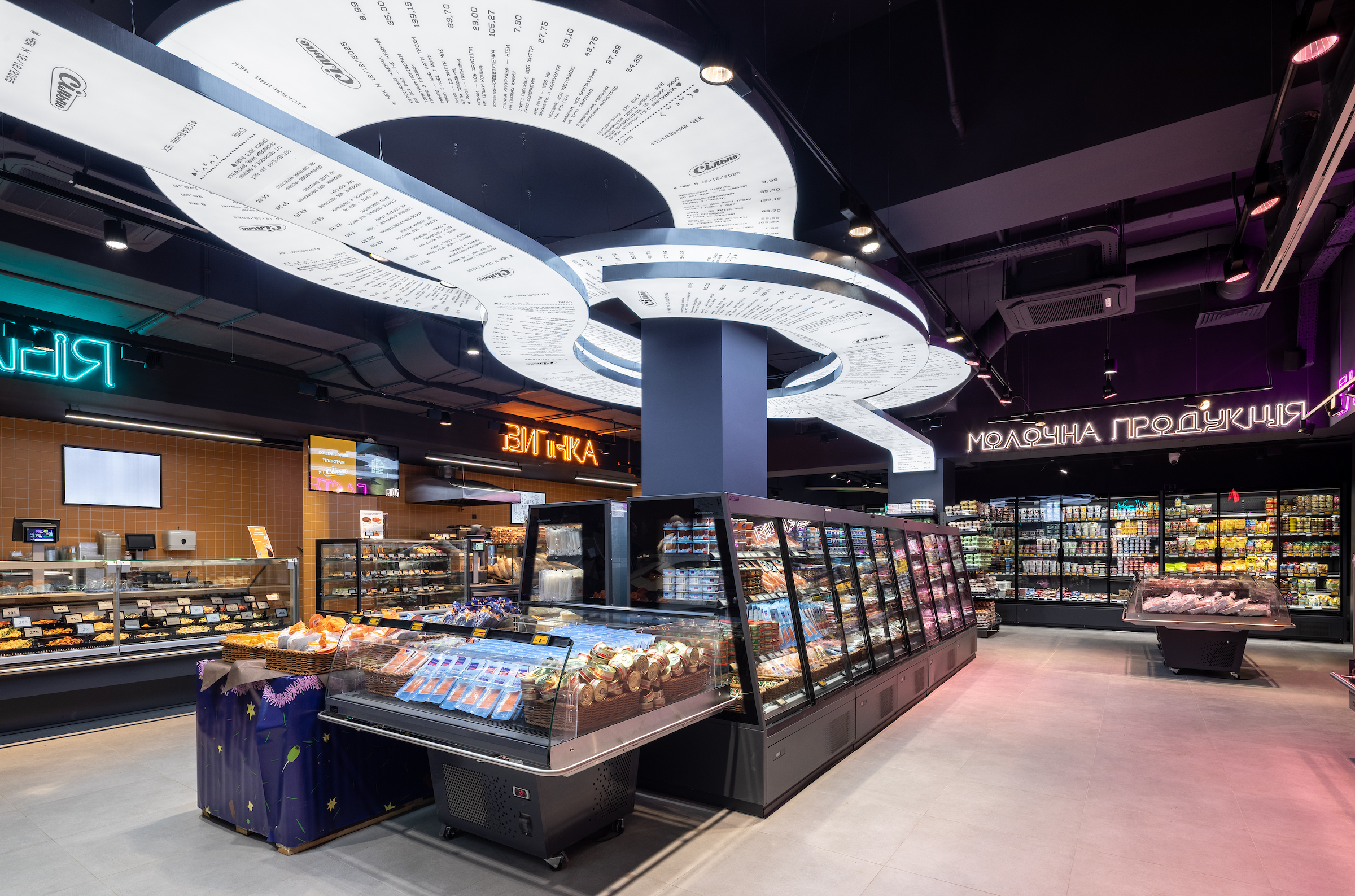 На вході гостей зустрічають стилізовані персонажі, а на стелі — кольорові лінії, кожна з яких веде до окремого відділу. Вивіски також виконані у вигляді лабіринтів, а центральним артоб’єктом магазину став великий чек «Сільпо».