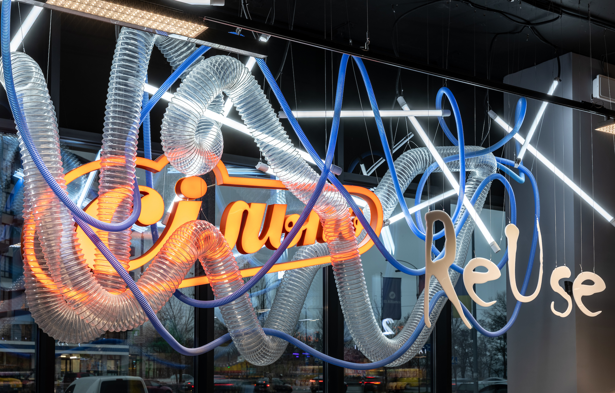 Інтер’єр магазину — це серія артінсталяцій із речей, які могли б опинитися на смітнику. Над простором працювала KOSA art group, а ключові об’єкти — «серце» та «легені» — зібрані зі старої оргтехніки. У магазині також можна побачити колону з металевих візків, арт із консервних банок і дисків, арку з автомобільних та мотофар.