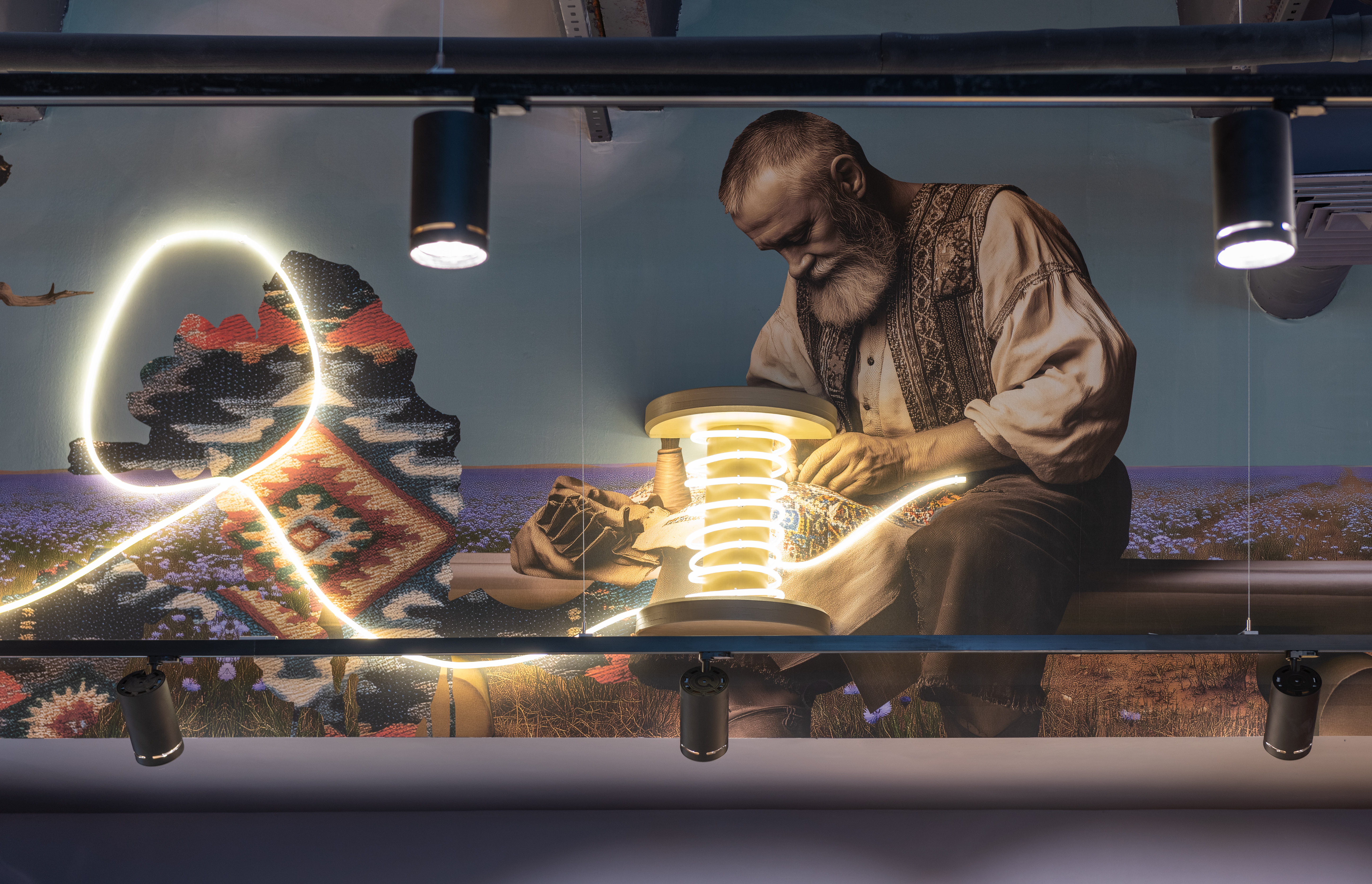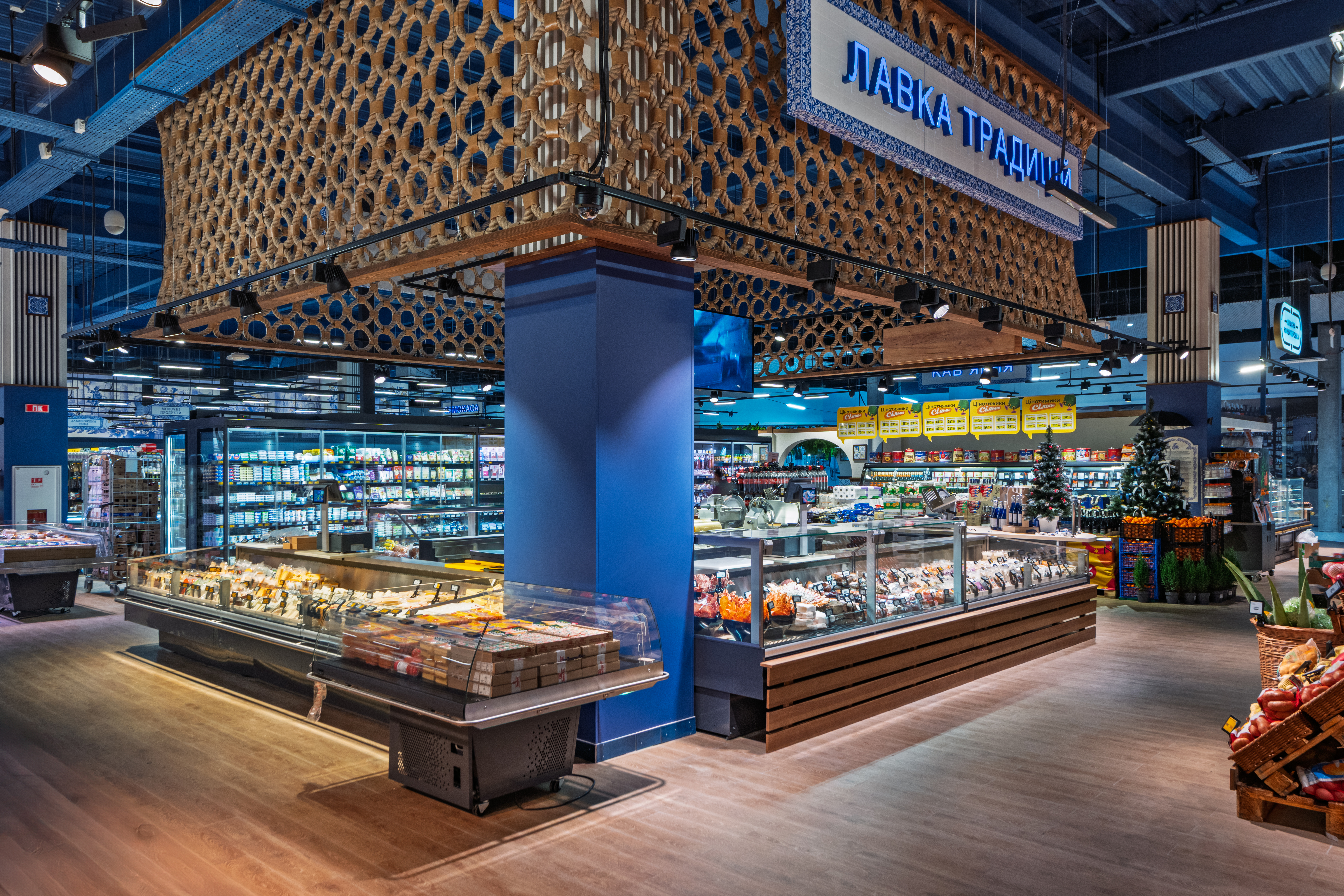 Інтер’єр поєднує натуральні матеріали, теплі кольори та національні орнаменти. Вхідний фриз стилізований під ткацький верстат, а неонова «нитка» проходить через назви всіх відділів. Навігацію виконали у формі гребінців для ткацтва, а над зоною «Садовина та Городина» розмістили артоб’єкт, що трансформується з верстата у килим.