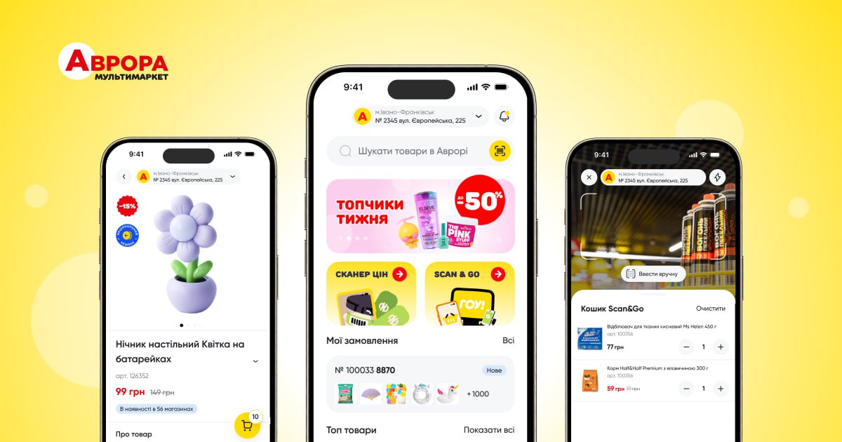 Мережа мультимаркетів «Аврора» запустила мобільний застосунок Aurora New Beta для iOS та оновлену версію для Android. Застосунок дозволяє замовляти товари онлайн, швидко перевіряти ціни в магазині, бути в курсі всіх акцій, а також самостійно сканувати товари в процесі покупок і оплачувати їх через смартфон.