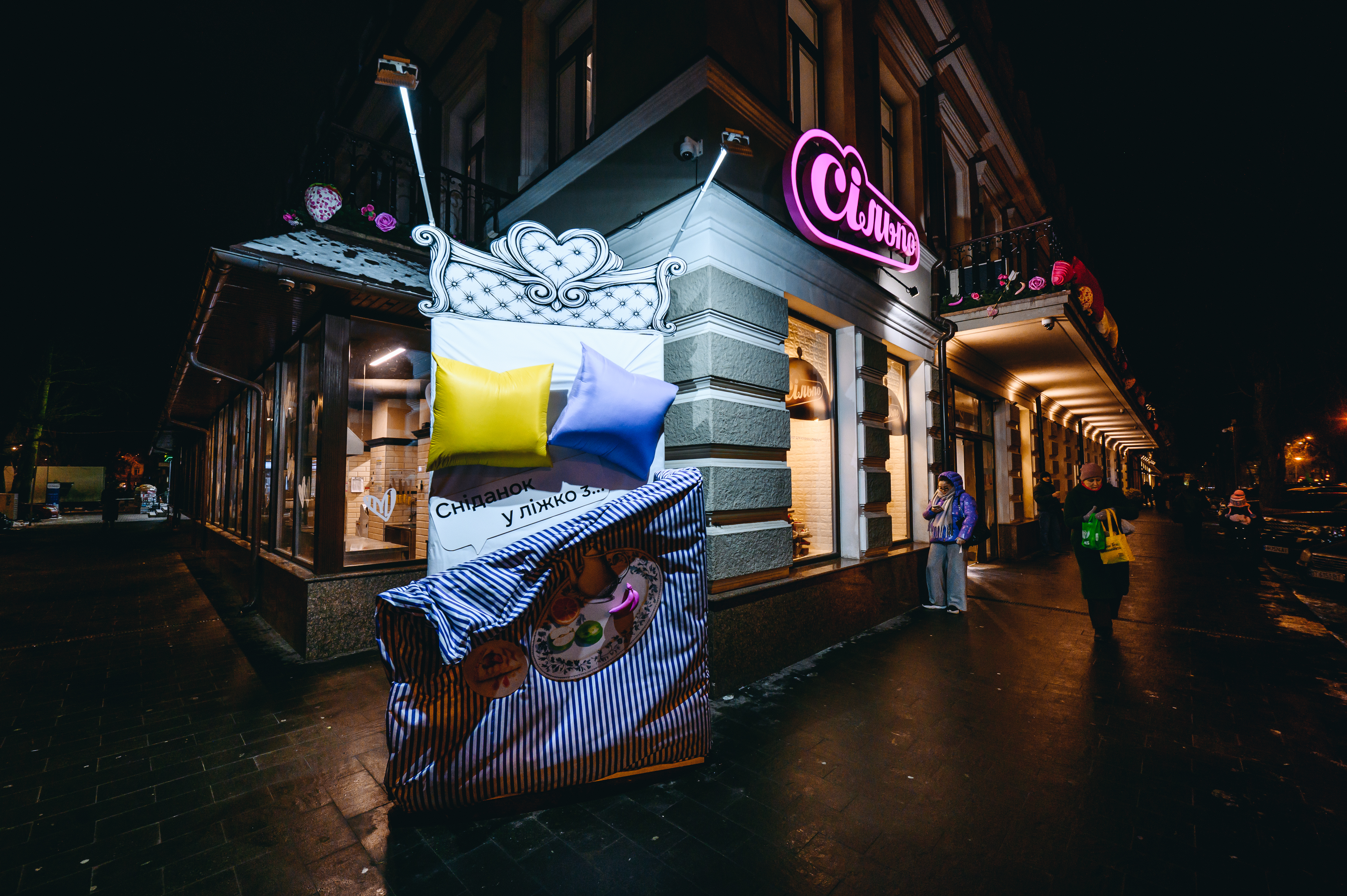 В Одесі на фасаді магазину з’явилося велике ліжко зі сніданком для фото. У вітринах можна підгледіти ідеї для романтичних сніданків, хоч дещо незвичних. Тут і улюблений сніданок з рушників і десерт для коханих та солодкий пампух з подушок. Такі деталі з легким одеським гумором нагадують, що побачення може бути простим і домашнім, але при цьому не менш романтичним.