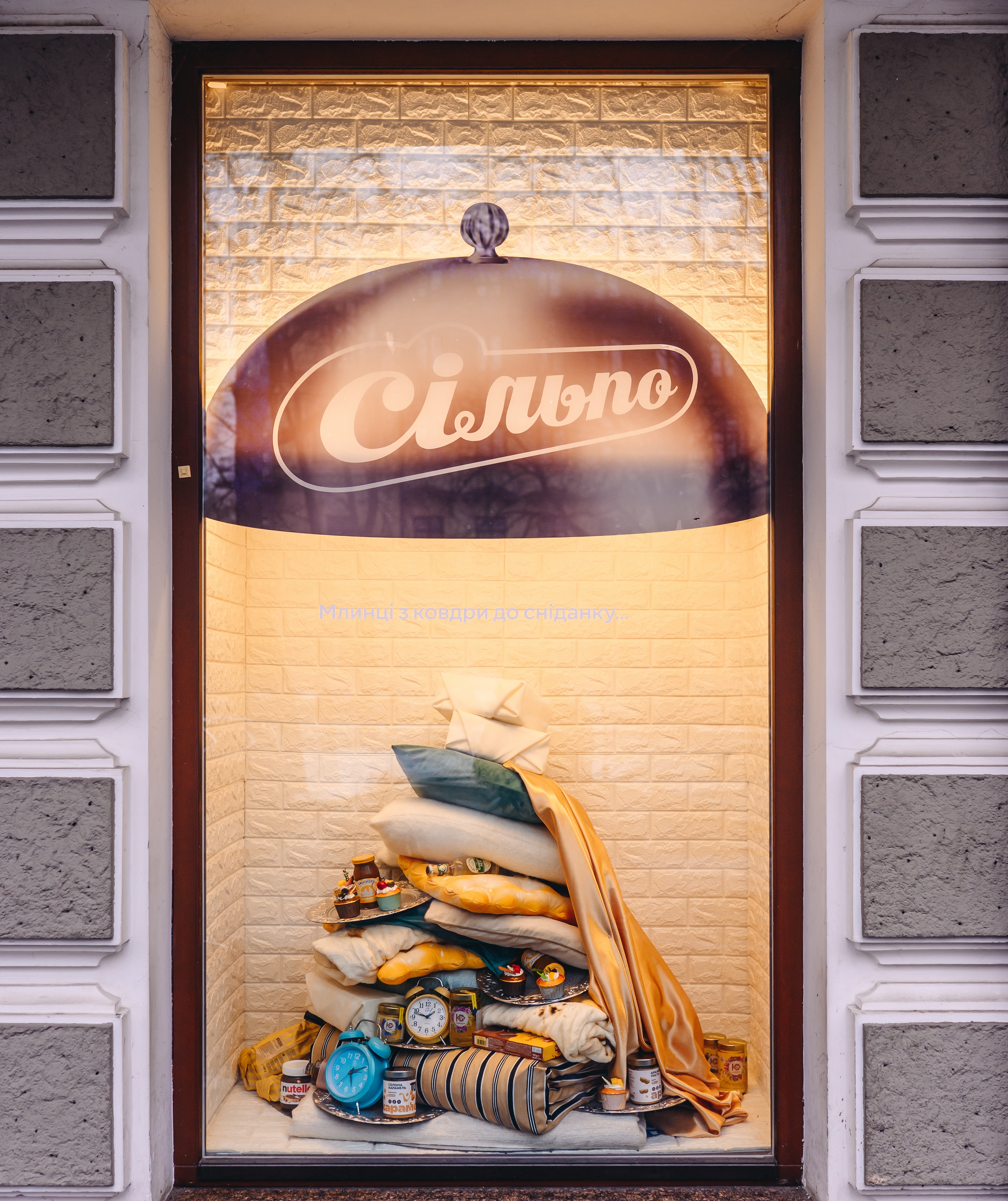 У Дніпрі вітрини «Сільпо» також нагадують про романтику неспішних ранків. Тут затишок створює безліч ковдр і подушок. А ідеї смачних сніданків витають у хмаринках або просто лежать на подушках, ніби на тацях. Поруч розташоване серце-дзеркало з надписом, де гості можуть зробити фото з натяком для коханих.