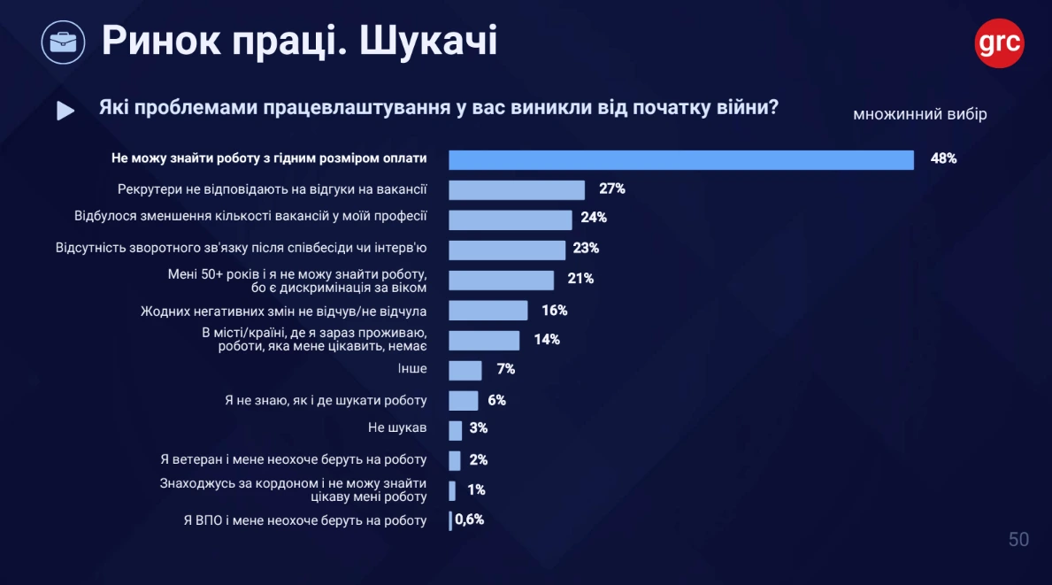 У середньому українці витрачають на працевлаштування від трьох до шести місяців. Найбільшою проблемою для шукачів роботи залишається рівень оплати праці. Майже половина респондентів зізнається, що не може знайти вакансію з гідною зарплатою. Кожен четвертий говорить про скорочення кількості вакансій у своїй професії, а частина спеціалістів стикається з відсутністю цікавих пропозицій у регіоні або країні проживання.
