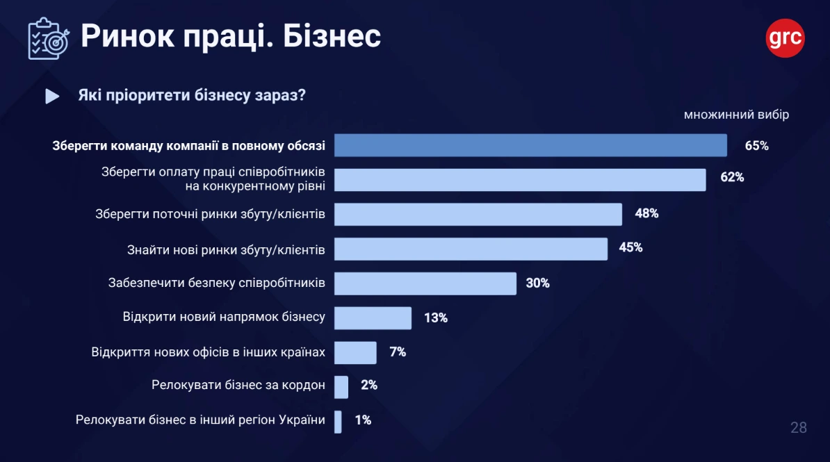 Фокус роботодавців змістився з оптимізації витрат на людський ресурс до його збереження. Майже дві третини опитаних компаній заявили, що наразі їхнім пріоритетом є утримати команду у повному складі.
