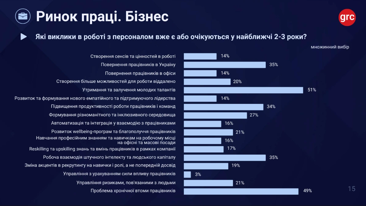 Третина бізнесів змогла зберегти всіх співробітників. Ще 43% компаній утримали від 70 до 99% персоналу. Для ринку, який ще кілька років тому переживав масові скорочення, ці показники виглядають як серйозний результат у бік стабілізації.