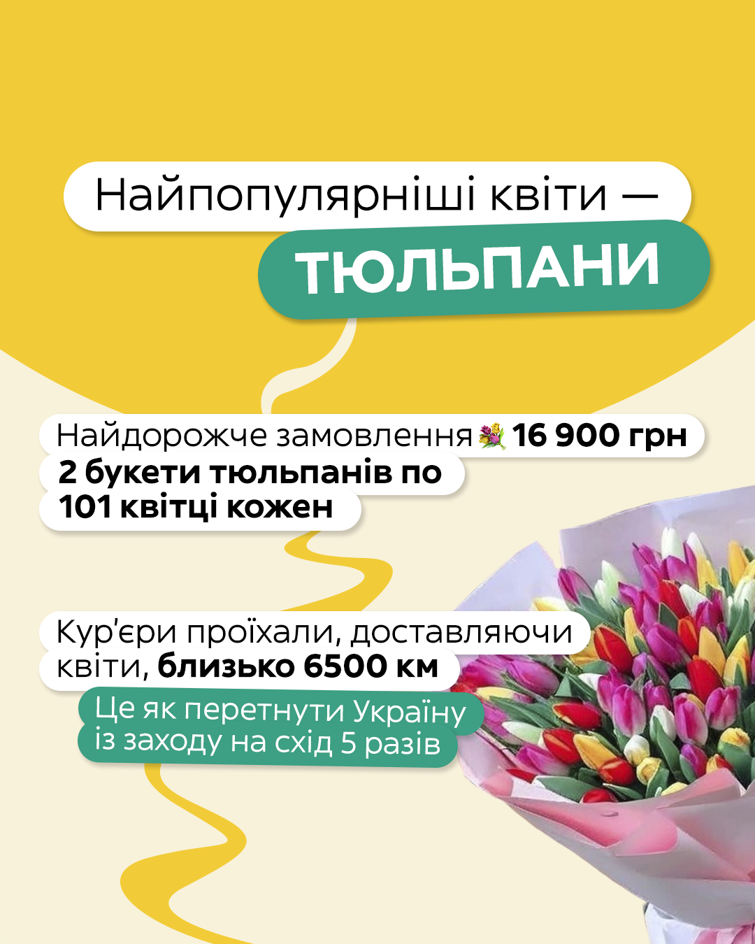 Квіткових замовлень було у 4 рази більше, ніж у звичайний день, і у 2,5 рази більше, ніж 8 березня минулого року. Тюльпани обирали найчастіше, і вони стали беззаперечним лідером серед усіх варіантів квітів.