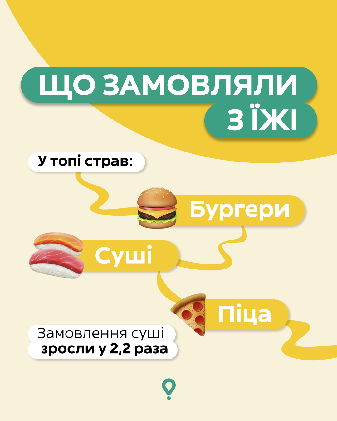 У топі гастрономічних уподобань традиційно опинилися бургери, суші та піца. При цьому попит на суші зріс у 2,2 раза. Солодощі замовляли на 60% частіше, а лідерами стали цукерки Raffaello, торт «Наполеон» та Kinder Surprise. Попит на ігристі вина та шампанське збільшився на 50%.