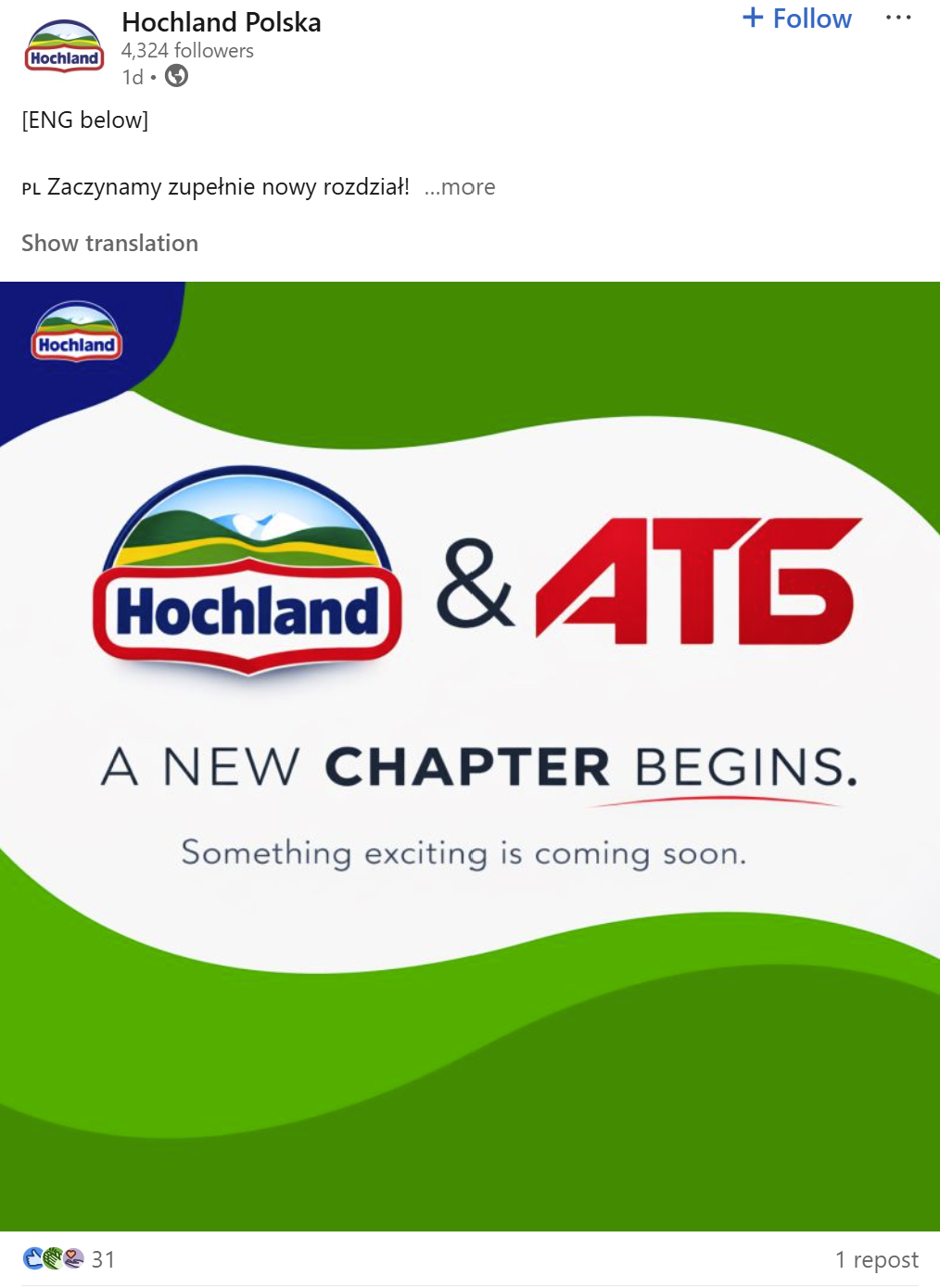Компанія Hochland Polska повідомила у соцмережах про старт співпраці з АТБ — лідером українського продуктового ритейлу. Завдяки цьому партнерству продукція бренду стане доступною для мільйонів українських покупців.