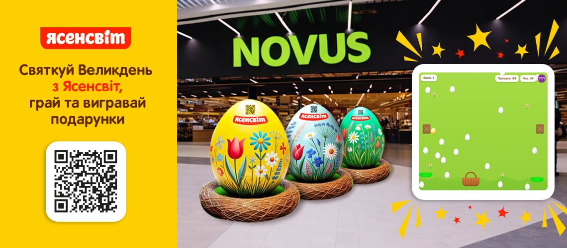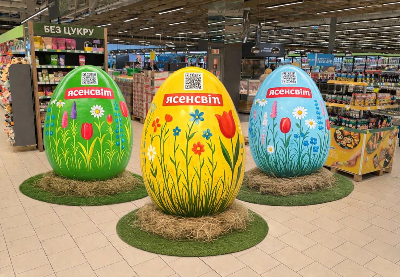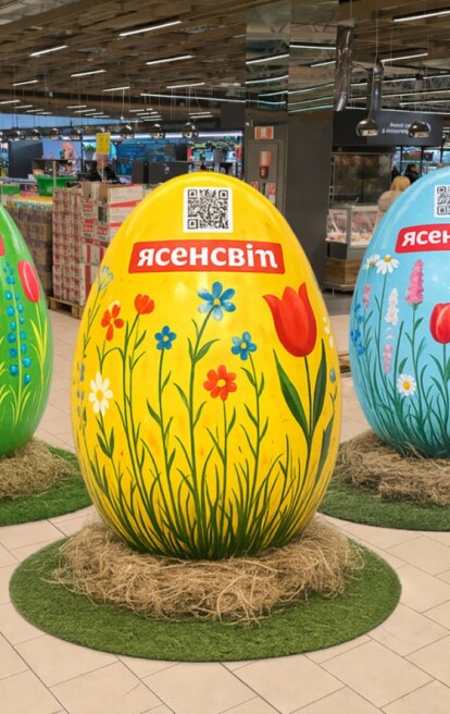 Бренд встановив три великі святкові яйця у трьох гіпермаркетах NOVUS у Києві. На кожному яйці розміщено QR-код, що веде до святкового відеопривітання від Ясенсвіт.